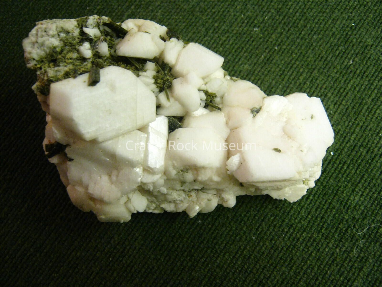 Description: A cluster of various sized crystals, milky white in color with some tiny green elongated crystals in pockets around one area on a dull yellow, white and green grainy matrix.