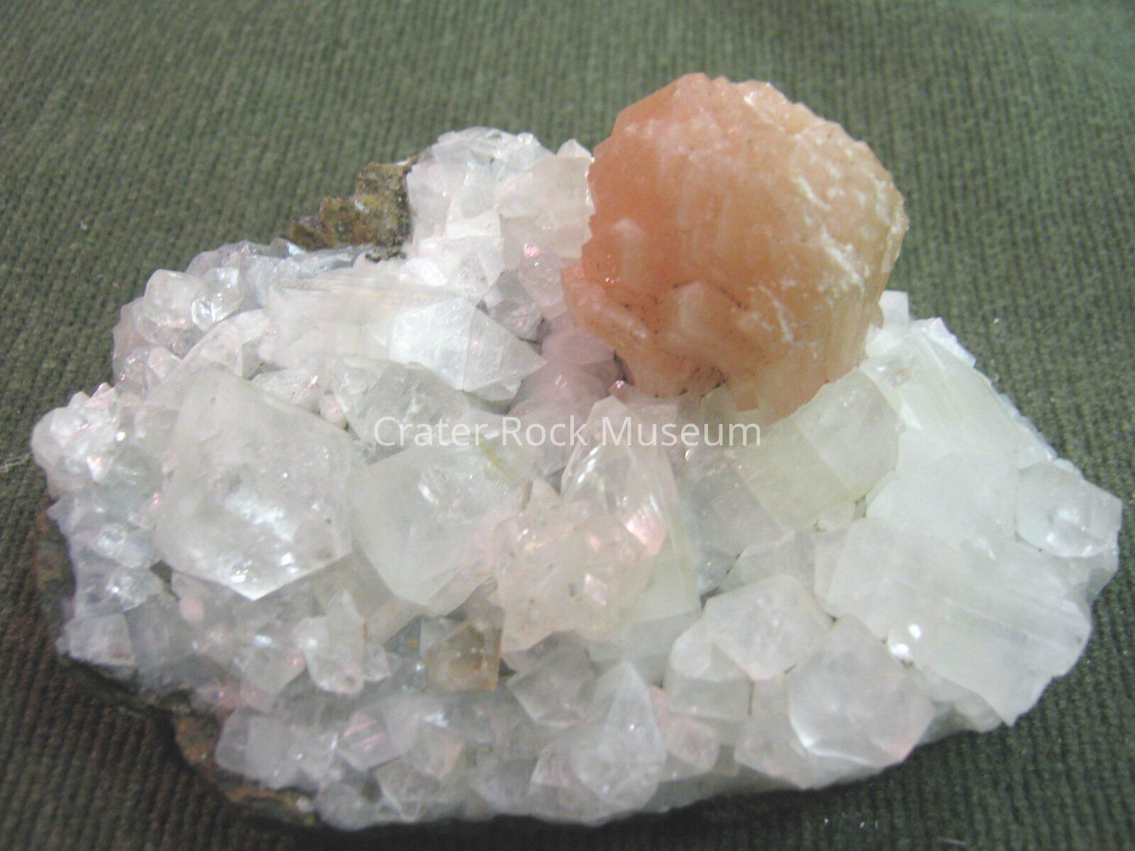 Description: Small specimen with translucent white crystals of various sizes clustered on a base, with a single Stilbite crystal, pink in color imbedded on it. The matrix is brown with worm-like striations across it, light brown in color.