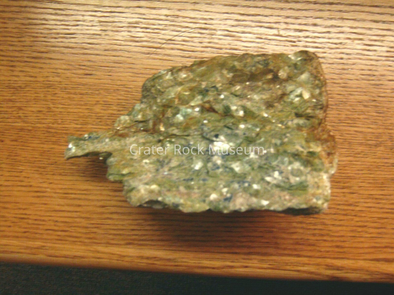 Description: Highly crystalline structure of mica with a slightly green hue and a small scattering of bluish crystal imbedded in the main body.