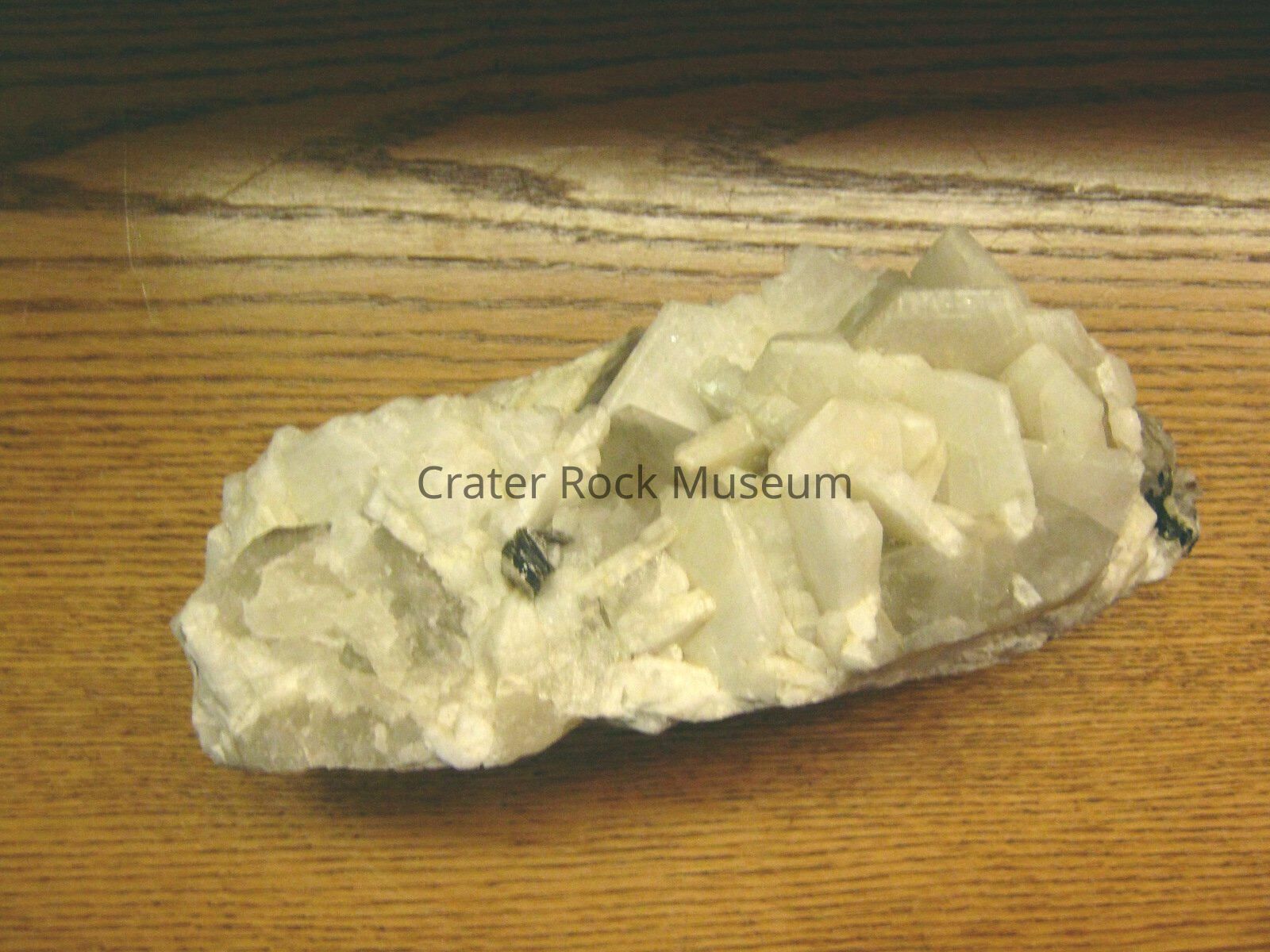 Description: Large thick wafer-like translucent white crystals with a few large transparent smoky gray crystals imbedded within it. A couple of small layered black crystals are also present.