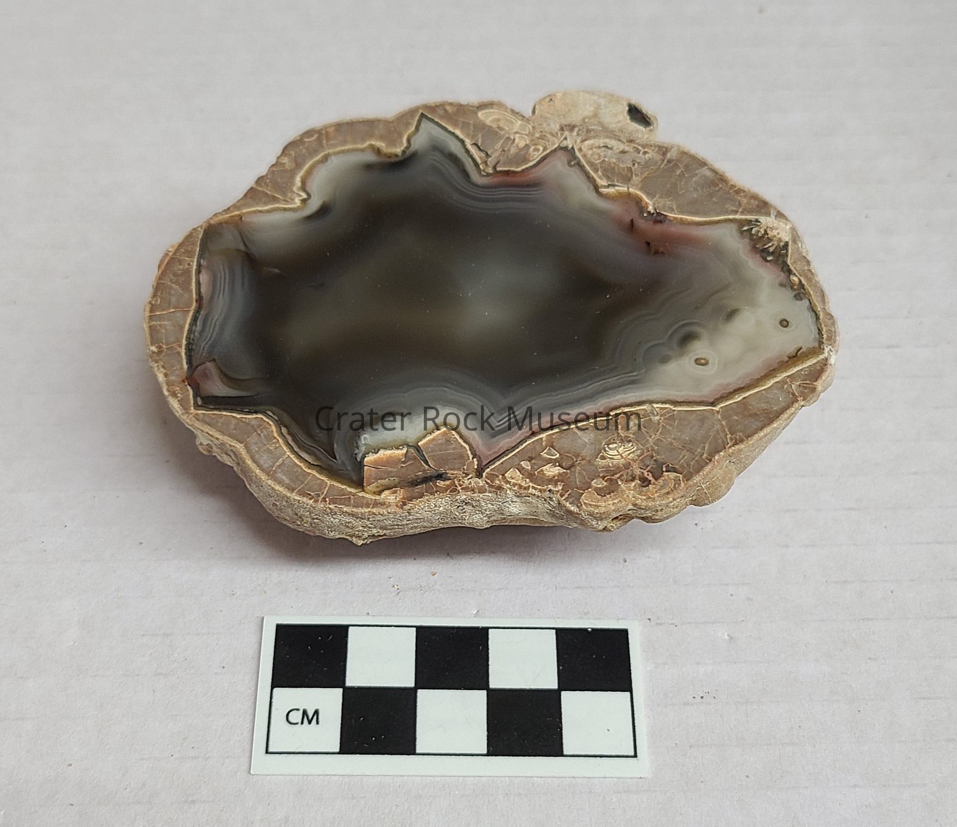 A Thunderegg from Deming, NM. Cut side shows fortified Agate center in Dark Greys, Grey Brown, Light Grey and some Piink. Surrounding rock in in Pinkish Grey, Grey and some Light Pink.Collection