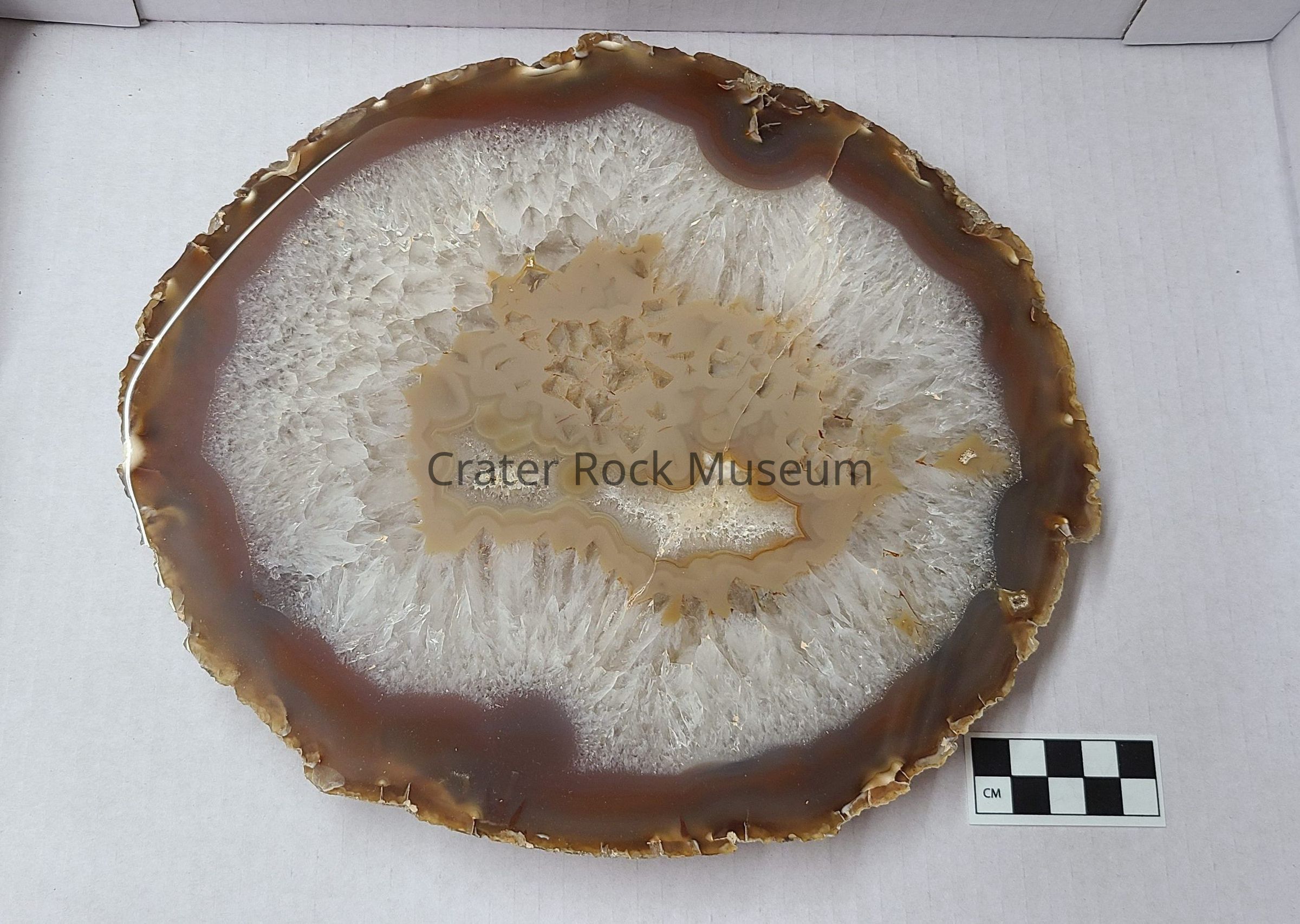 A 7/8" (2.2 cm) thick slab of an Agate from Brazil with a Tilt in its bedding lines. Piece is unusual for the Sharp Tilt. Polished side shows Crystalline area at one end followed by bedding lines in Yellow, Orange, Blue Greys, White, some Pale Olive. Surrounding fortified Agate is along two thirds of outer edge in Pale Olive, Orange Brown, Blue Grey and Black.Collection