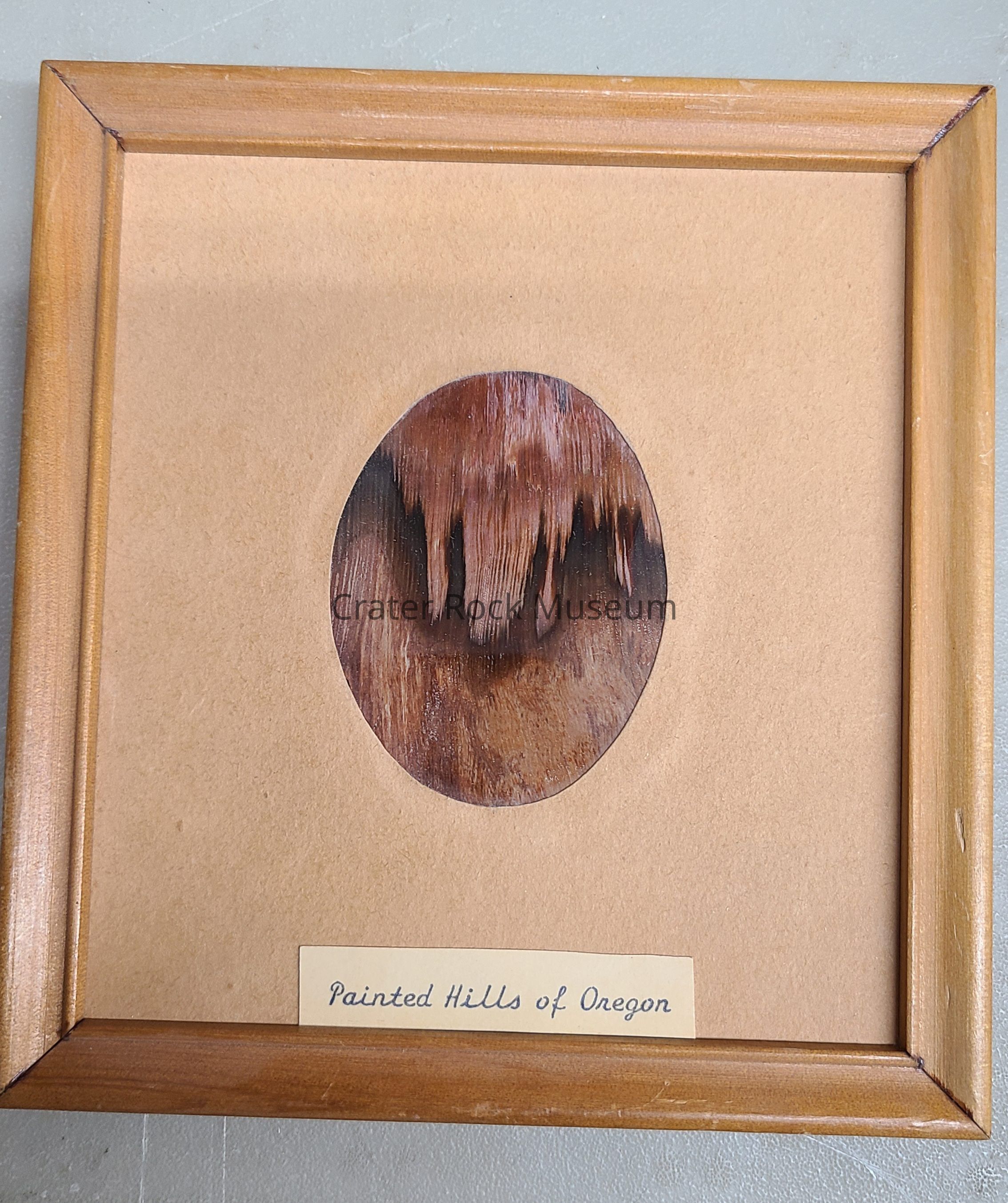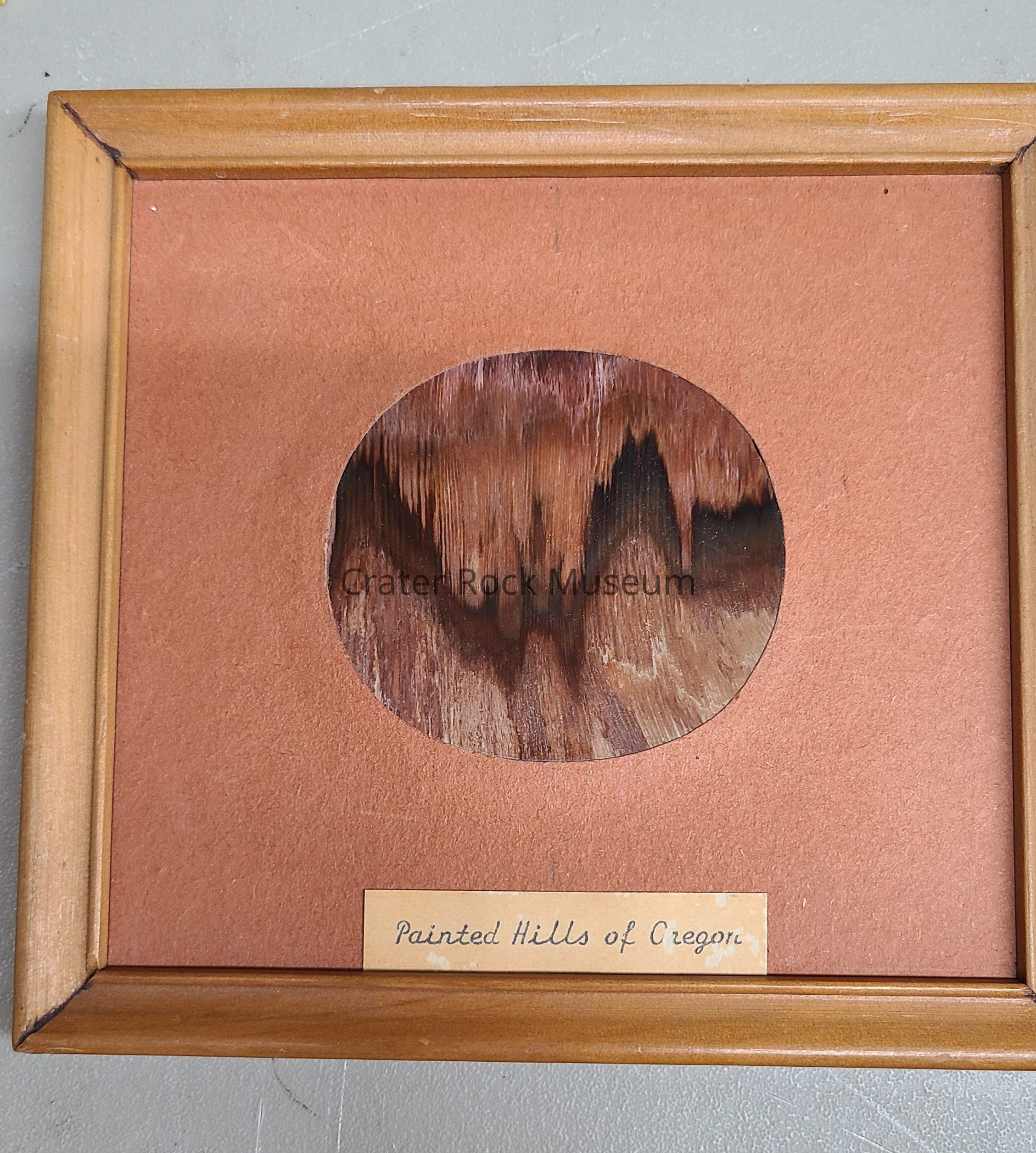 Two framed slices of petrified wood, cut with the grain, which came from the forests in Sweet Home, Oregon, near Salem (east-central Oregon), One slice is in a beige background made of construction paper, and the other in a rust colored background. Both are in a light brown wooden frame with title "Painted Hills of Oregon". Probably from the Oligocene epoch, Tertiary period, Cenozoic era. Sizes of wood differ slightly. Wood is in various shades of brown.Collection
