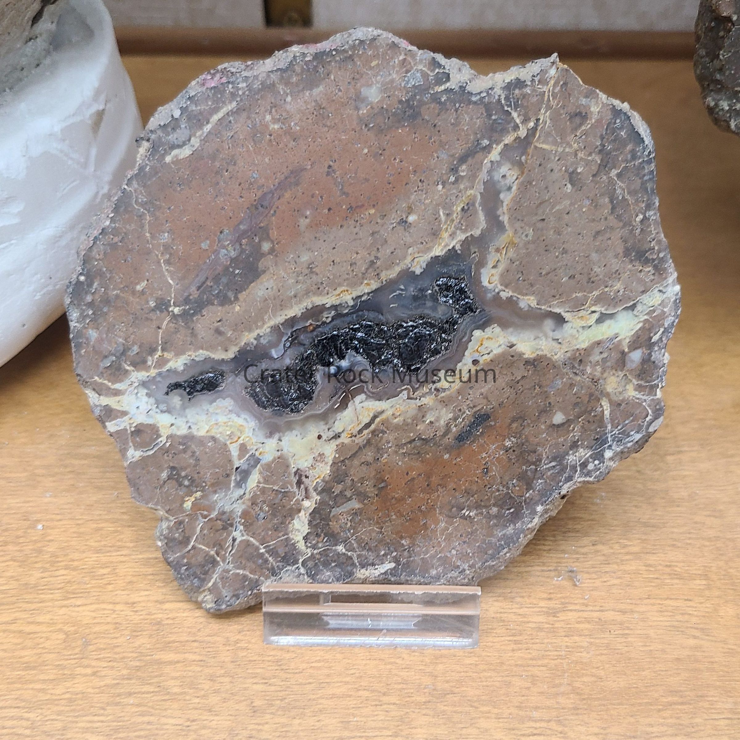 5/16" thick slab with a roughly central 'X' shape agate surrounding a core of natural asphaltLocation