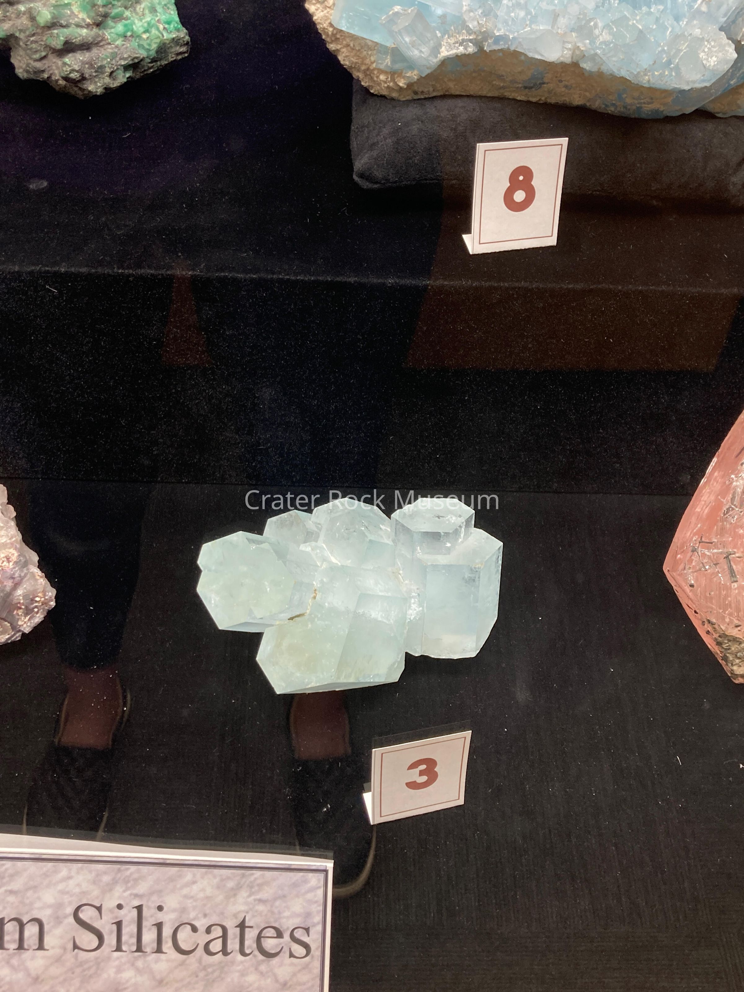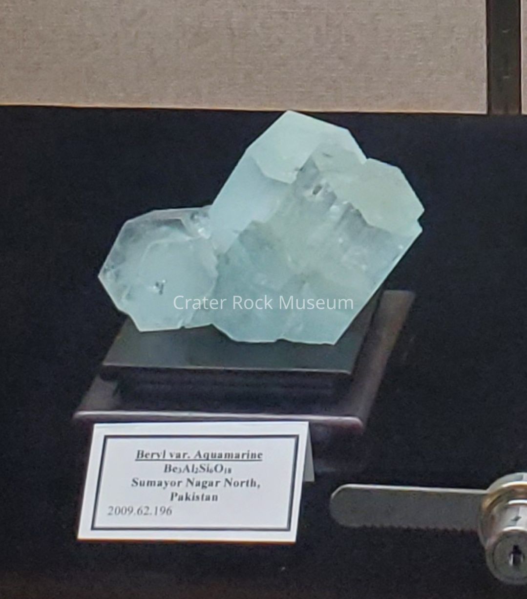 Variety: Aquamarine is the blue, or perhaps more correctly, blue-green or aqua variety of the mineral beryl. Aquamarine is colored by trace amounts of iron. Most gem aquamarines have been heat treated to produce the popular blue-green colors from less desirable yellow or pale stones. Aquamarine is sometimes found in huge crystals (unlike emerald). It is also known in a glassy form, often without showing crystal form, and sometimes with many holes or other odd shapes. Other times a large cluster of prismatic crystals can be seen to all have the same alignment - a sign that it is really a single crystal with many faces.Collection