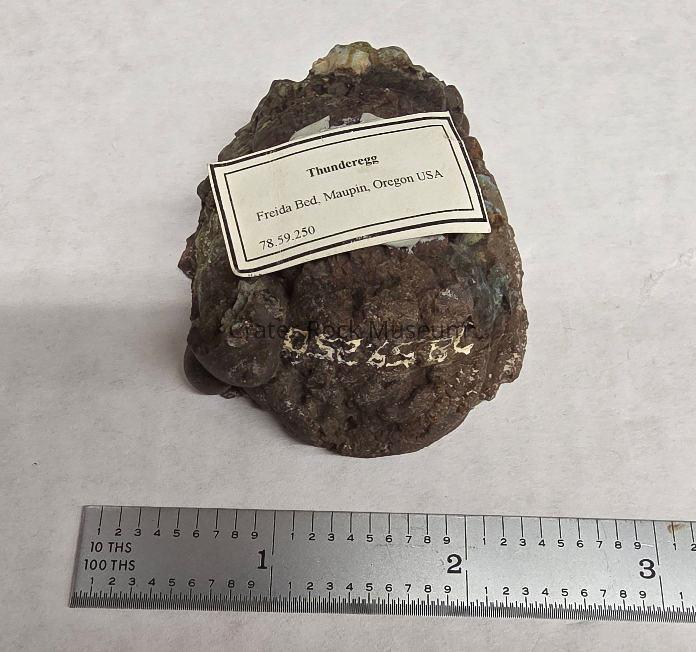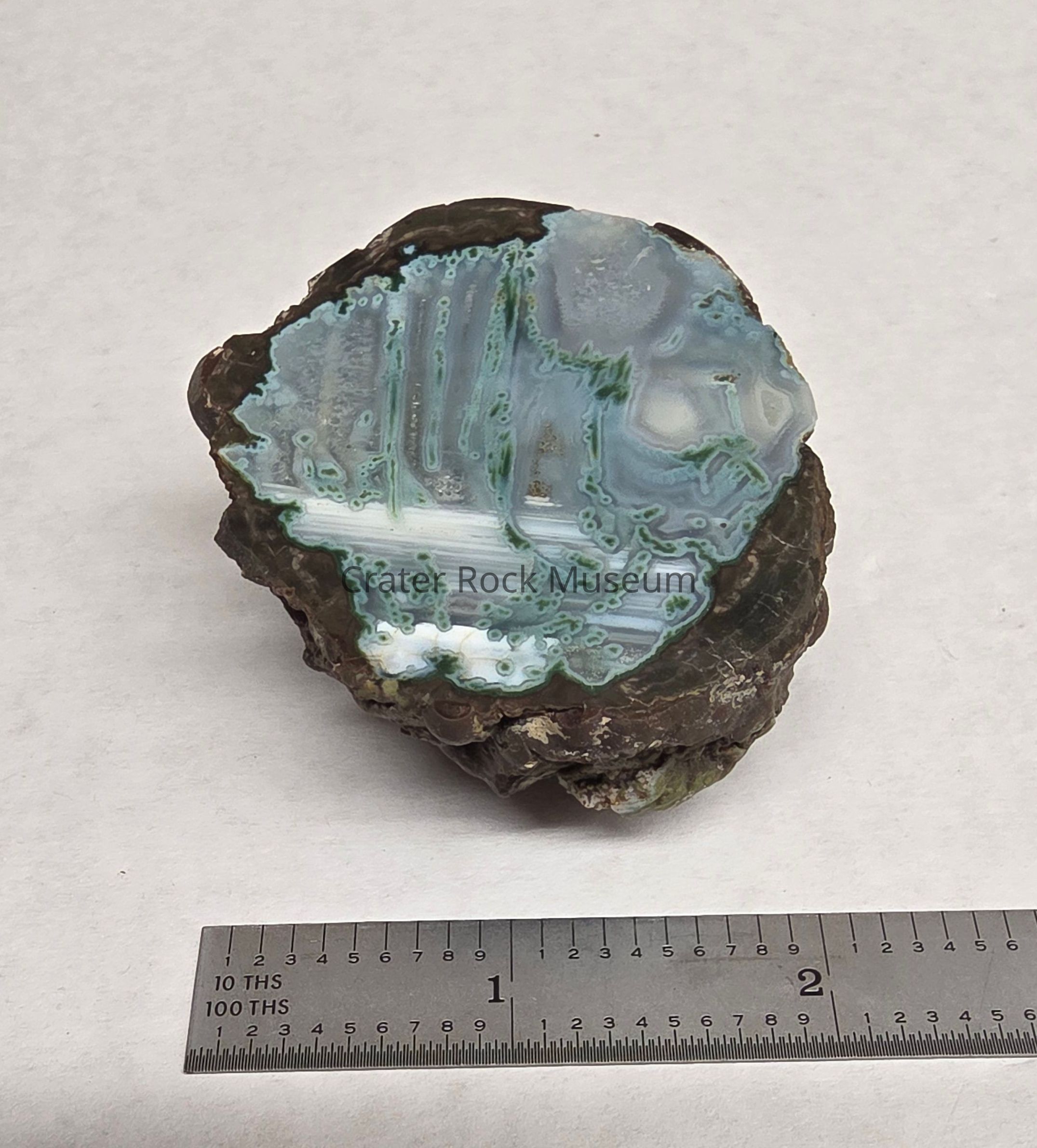A small Agate Egg from the Freida Beds along the Deschutes River, near Maupin, OR (North Central OR) containing Green Moss and Snowy Patches in a Green-Blue semitransparent background. Dark Brown Opaque material surrounds center. Bedding lines in White are apparent. Unpolished side shows a Green streak across middle.Dimensions