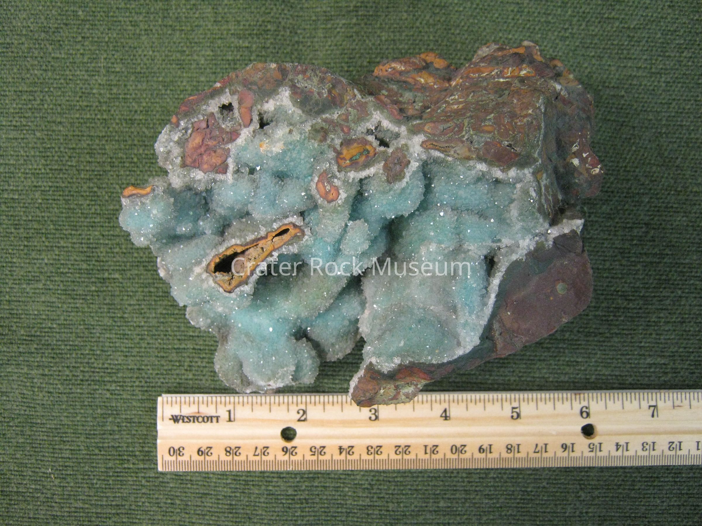 DESCRIPTION: Turquoise, druzy crystals of Quartz with green patches of Chrysocolla in the matrix.