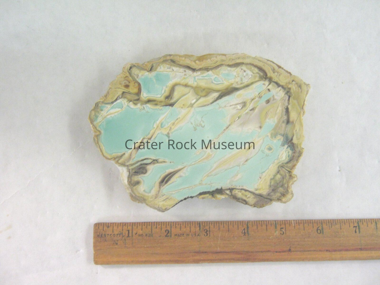 Description: Thin slab with medium to light green polished face. Heavy marbling with light yellow to light brown streaking throughout.