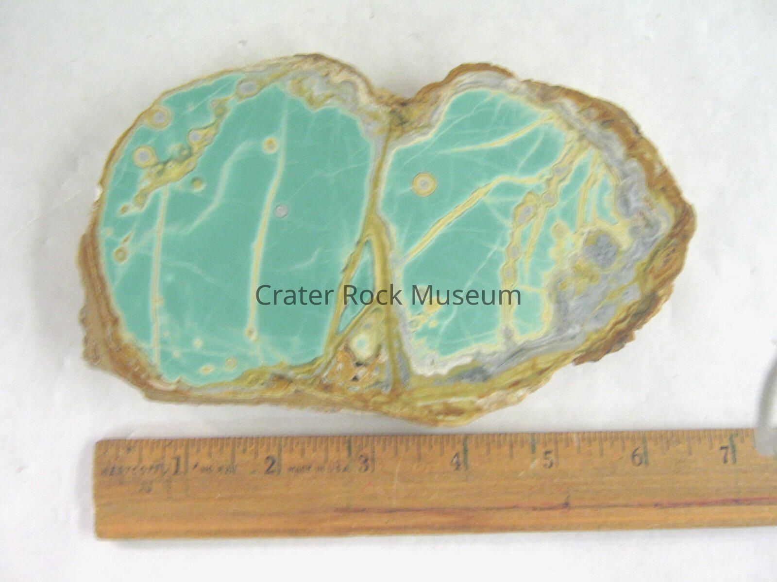 Description: Thin slab with a polished face colored pale green to a yellow and grey matrix that divides the variscite through the center.