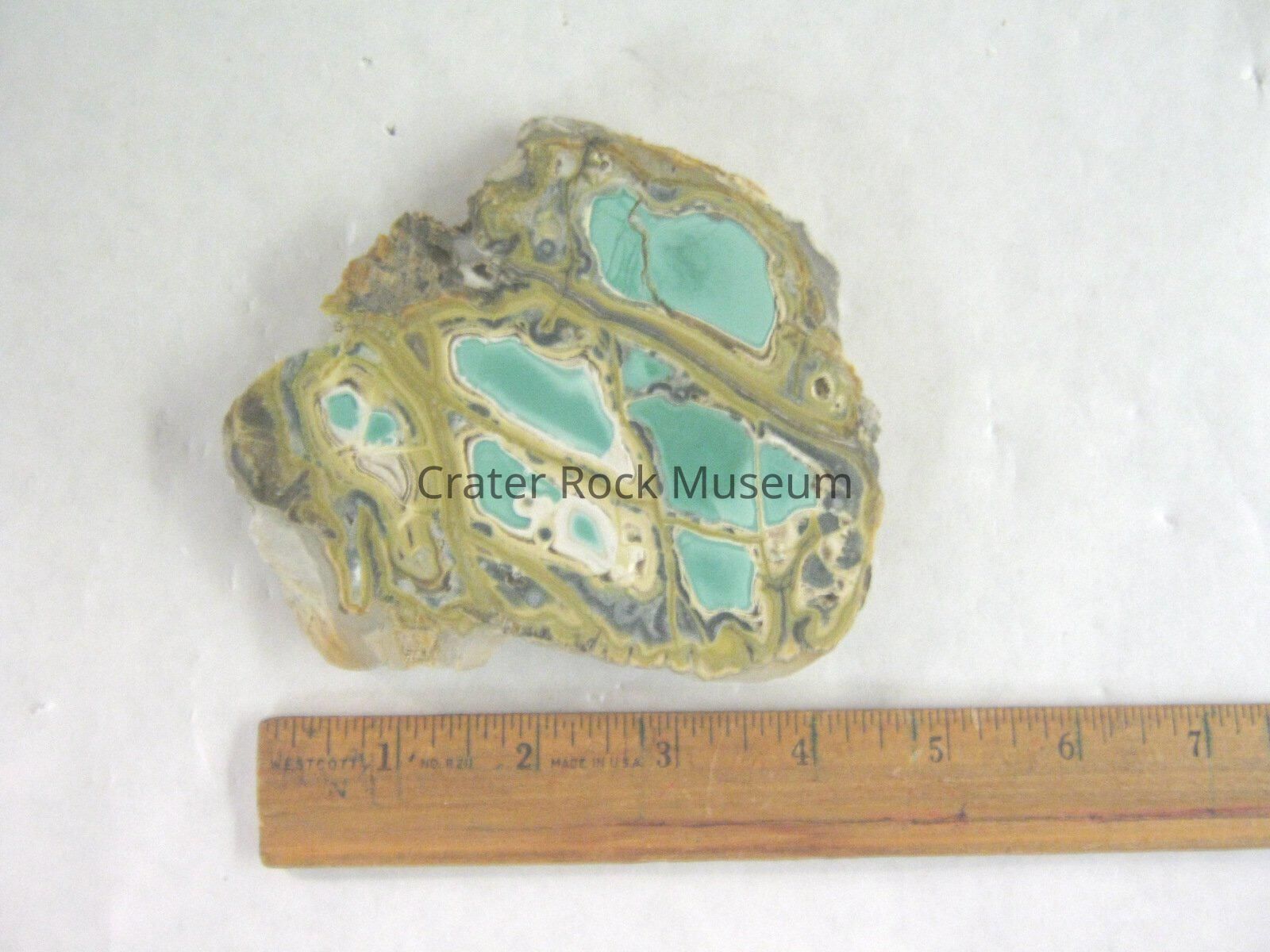 Description: Thin slab with polished face spotty sections of variscite varying from green to a very pale green with thick matrix lines surrounding seperate cells of mineral colored grey, tan to yellow.