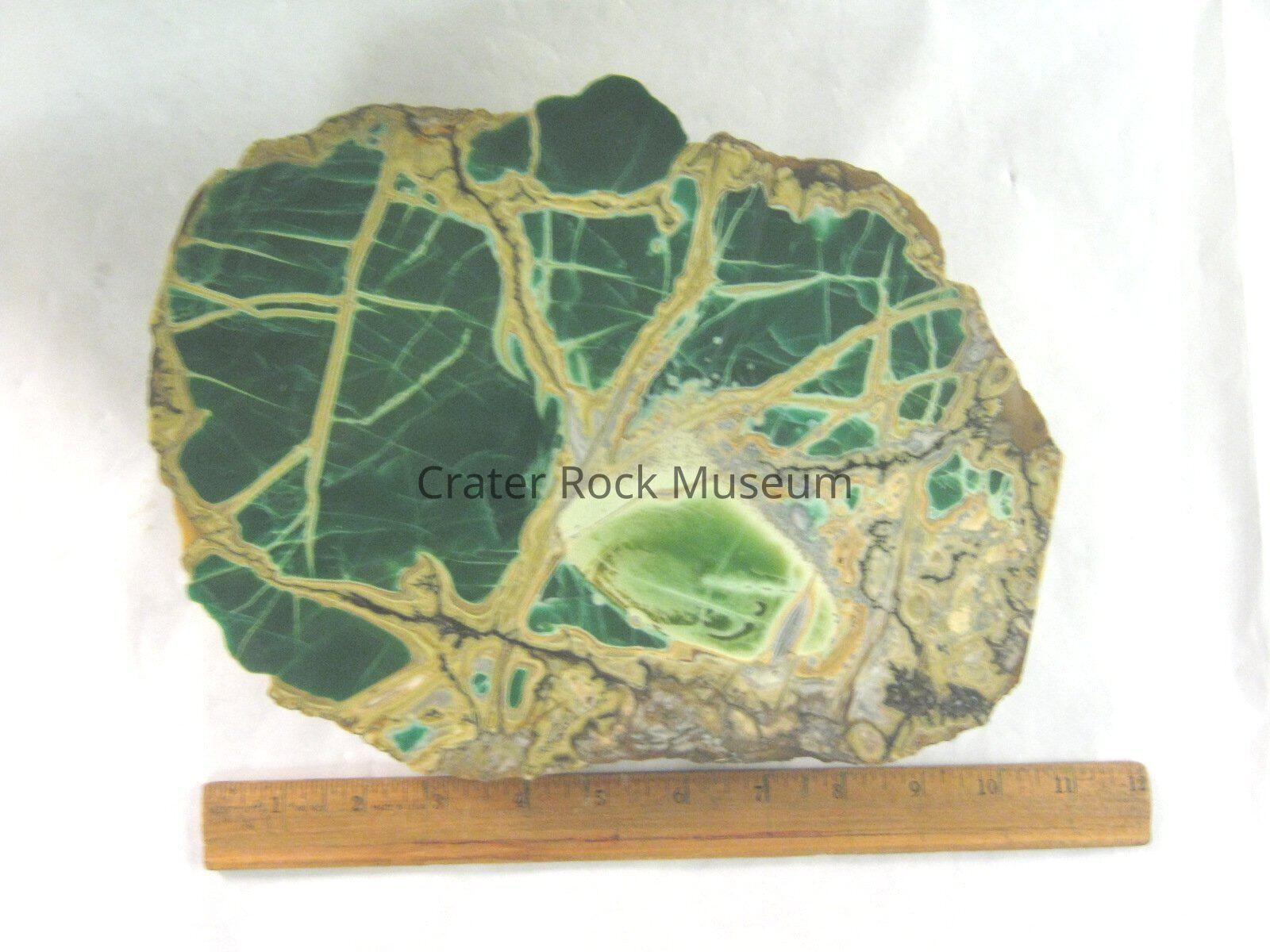 Description: Rounded slab with polished face colored a dark green with a light green spot off to the side of the main body a large portion of matrix covers one side with light to heavy striations run through the mineral.