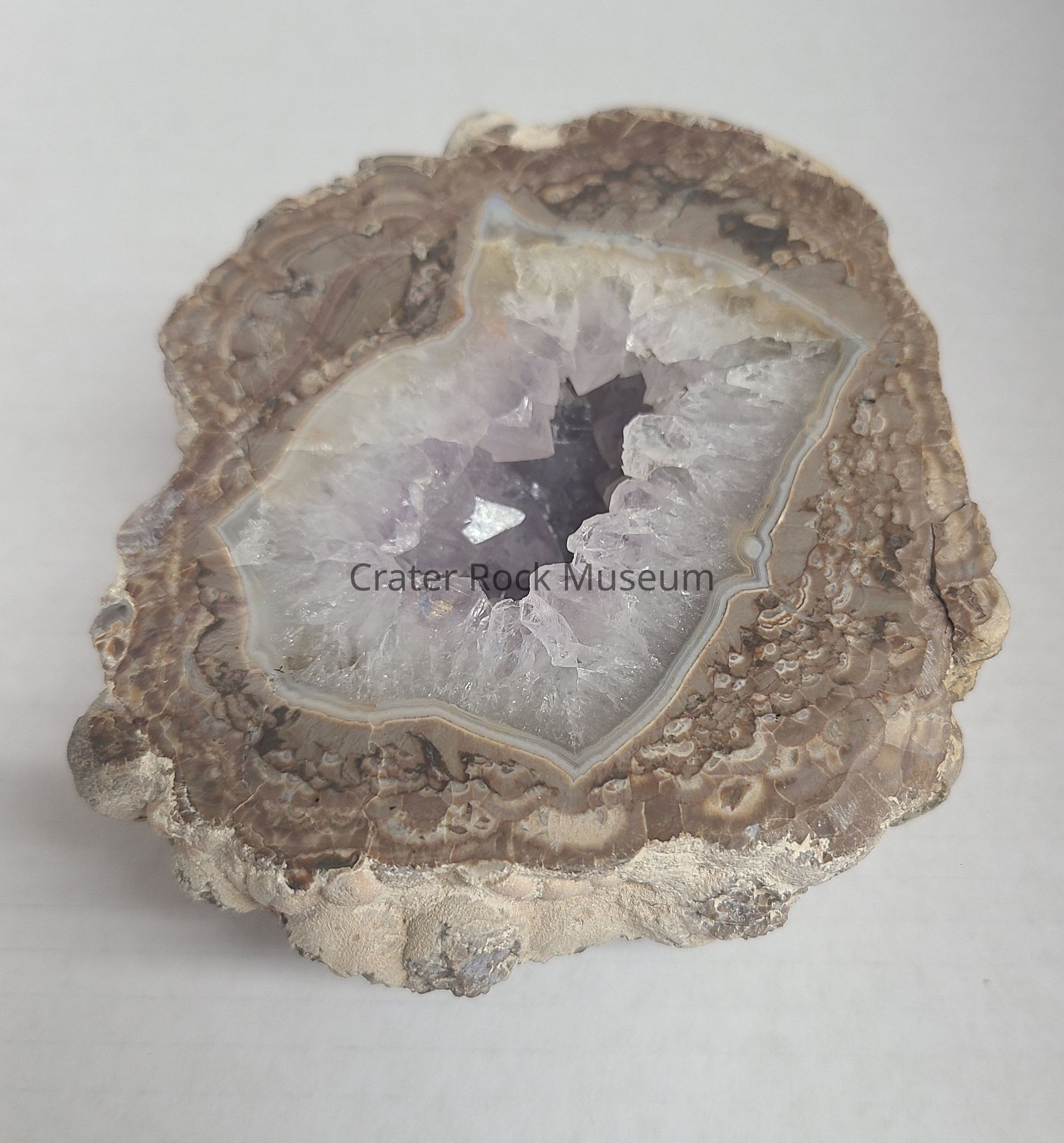 A Thunderegg from NM. Cut side shows open faint Amethyst and White Crystalline center, roughly square in shape surrounded by a Light and Medium Grey fortified line. Surrounding rock is in Pinks, Pink Grey and Brown. Some surface cracks.Dimensions