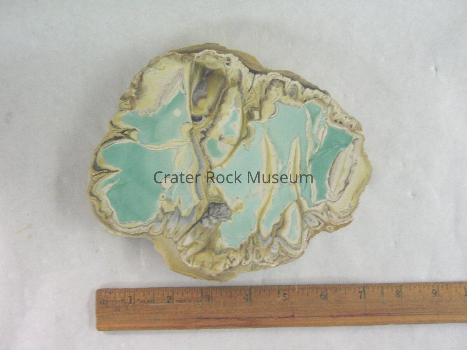 Description: Thin slab with a polished face colored light to medium green with light tan and yellow matrix running sporadicly throughout the specimen.