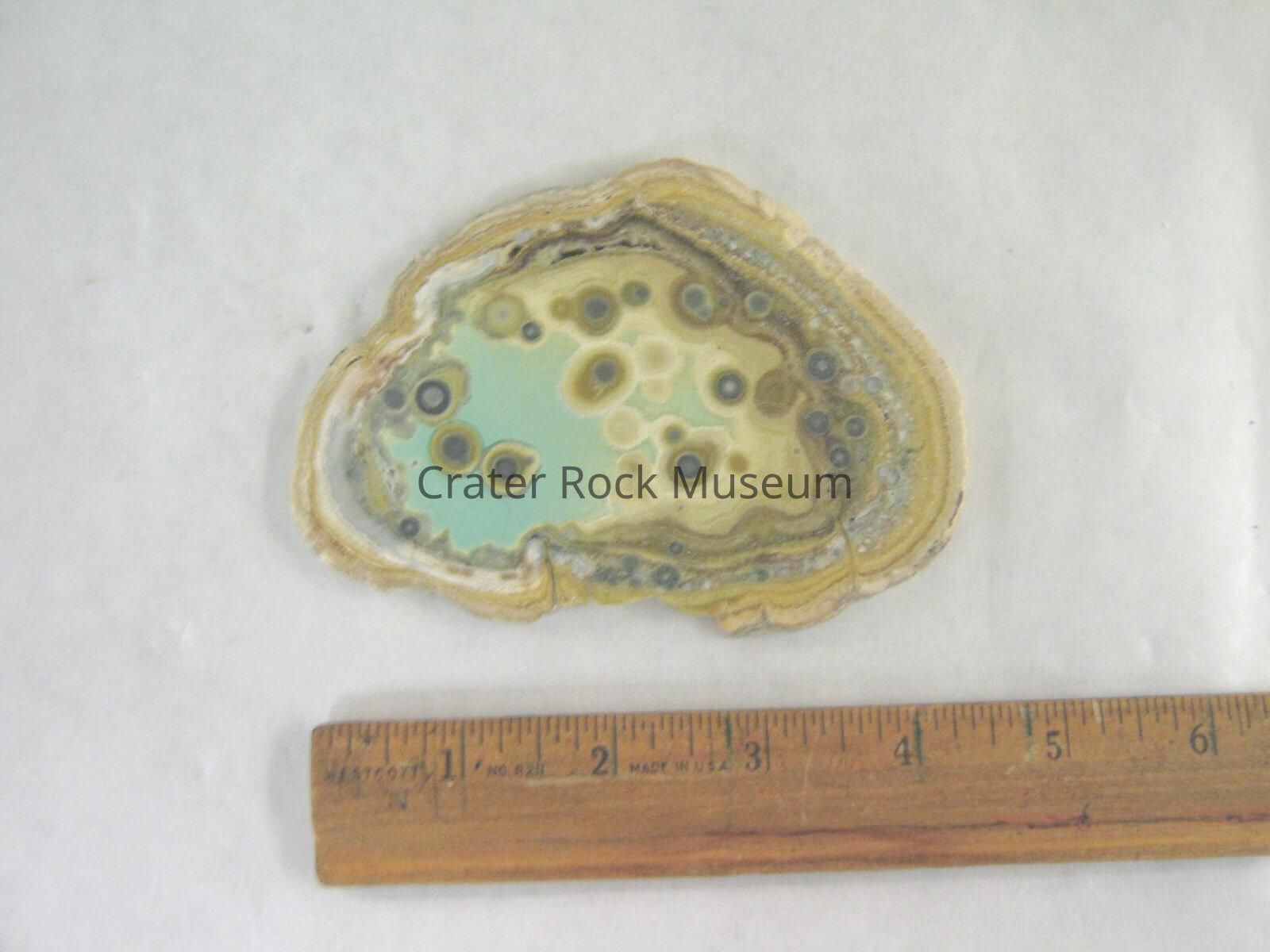 Description: Very thin slab with polished face colored light green with nodules of a yellowish to tan matrix intertwinned in the variscite .