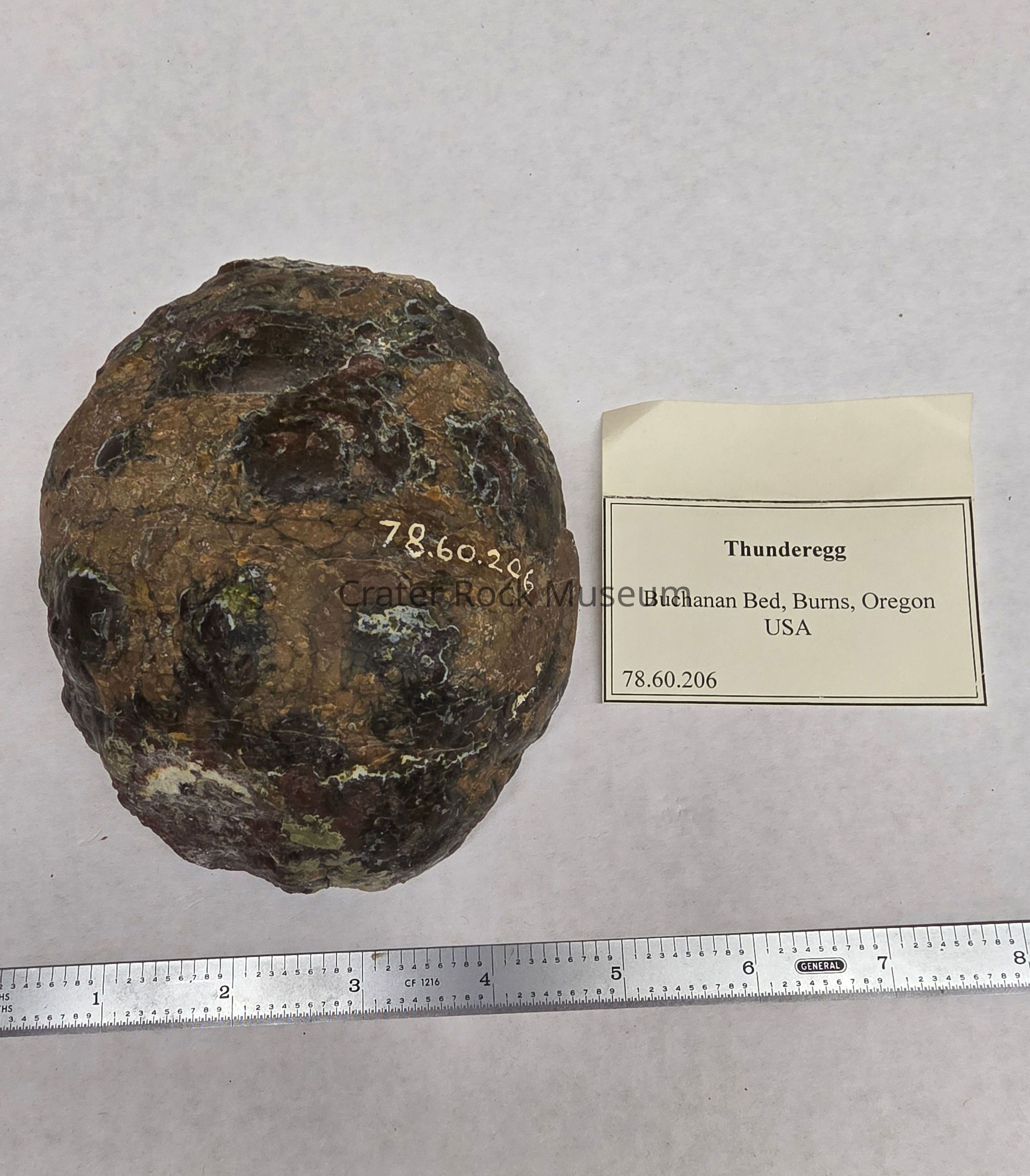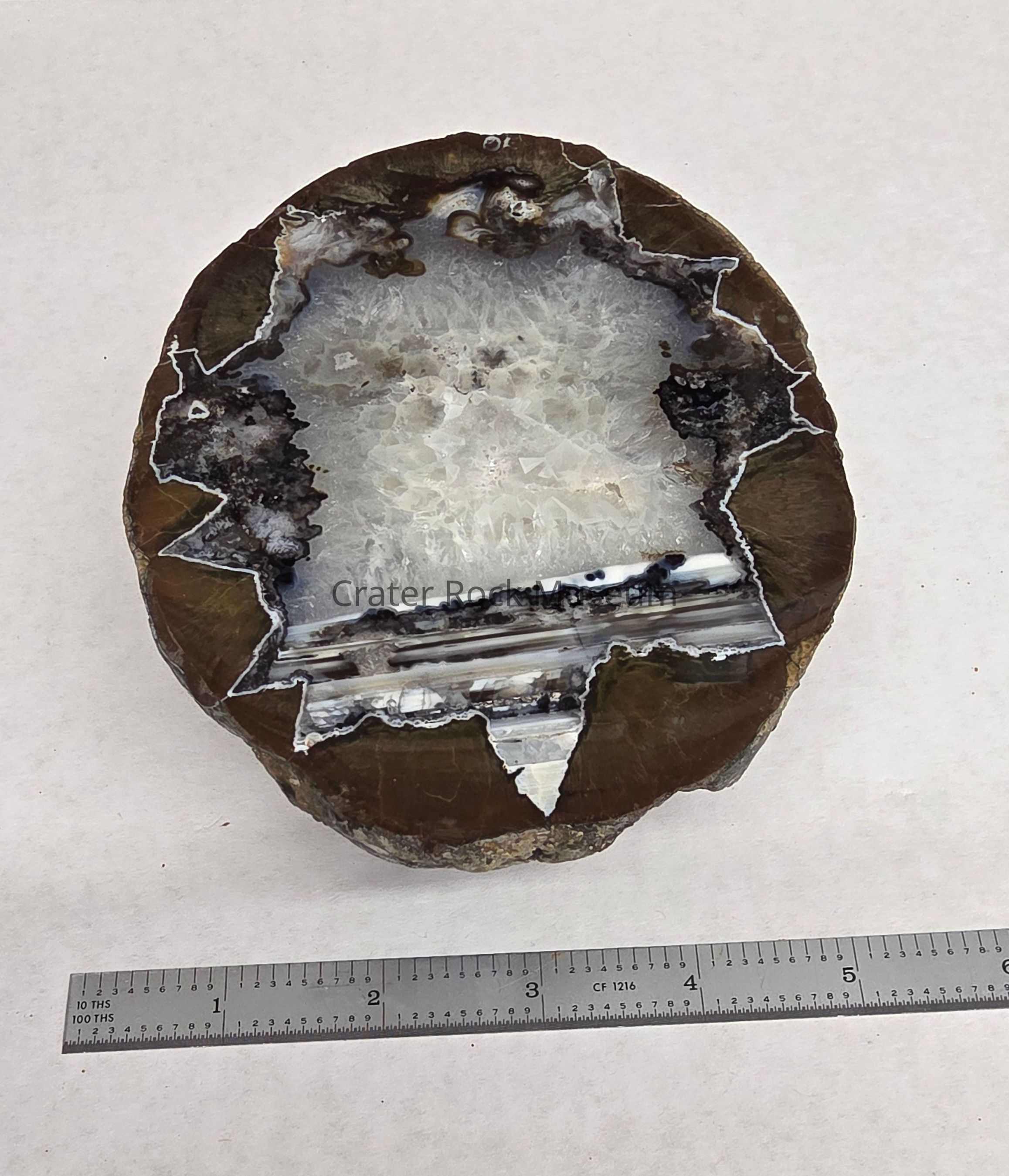 A Thunderegg from the Buchanan Beds in Burns, OR (Eastern OR). Cut side shows Star center in Crystalline, White and Grey with fortified and bedded Agate at edges in White, Grey, Brown and Black. Outer rock is Brown.Dimensions