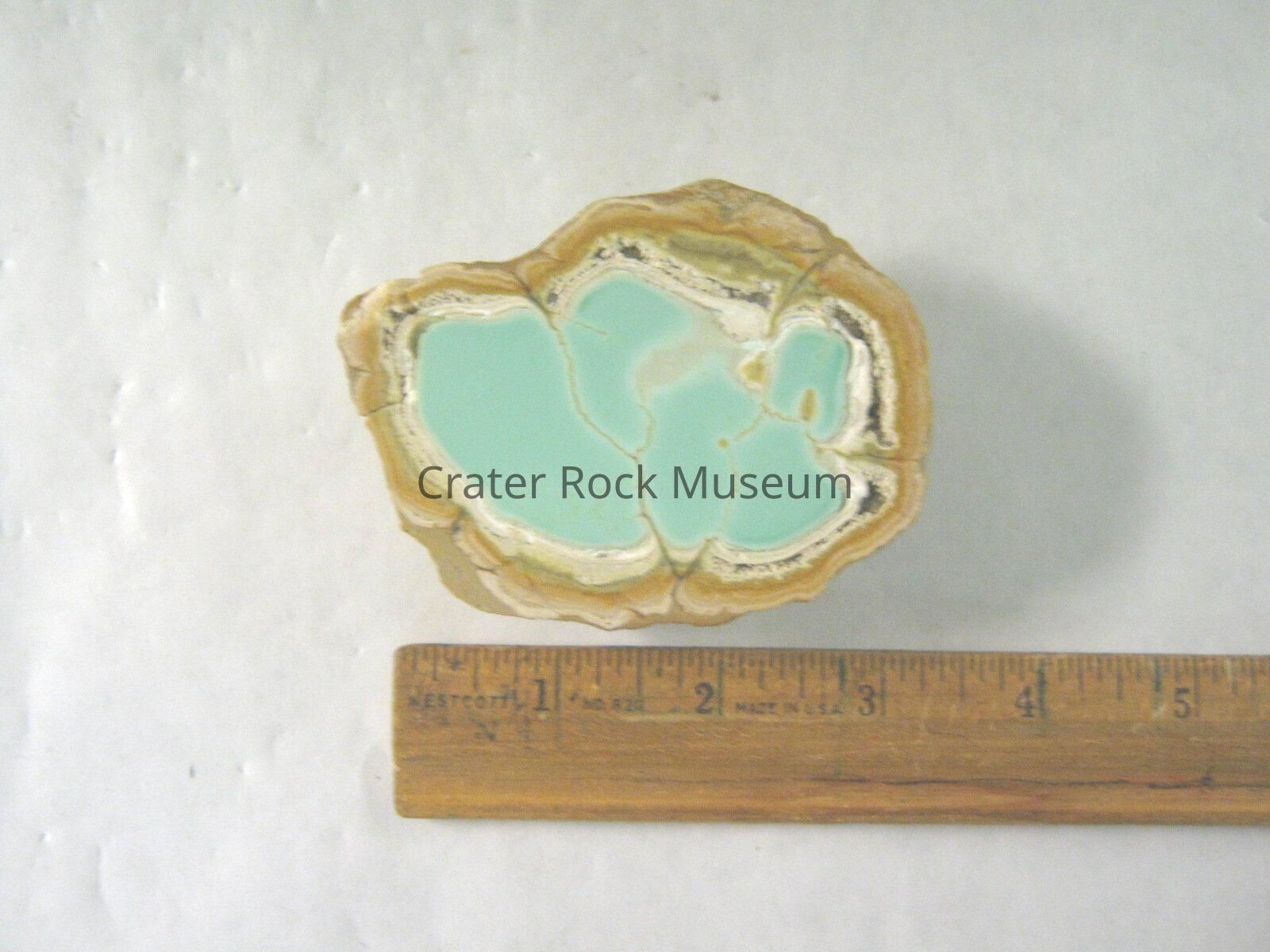 Description: The slab has a rounded back with polished face colored a solid pale green surrounded by a tanish-yellow to light brown matrix.