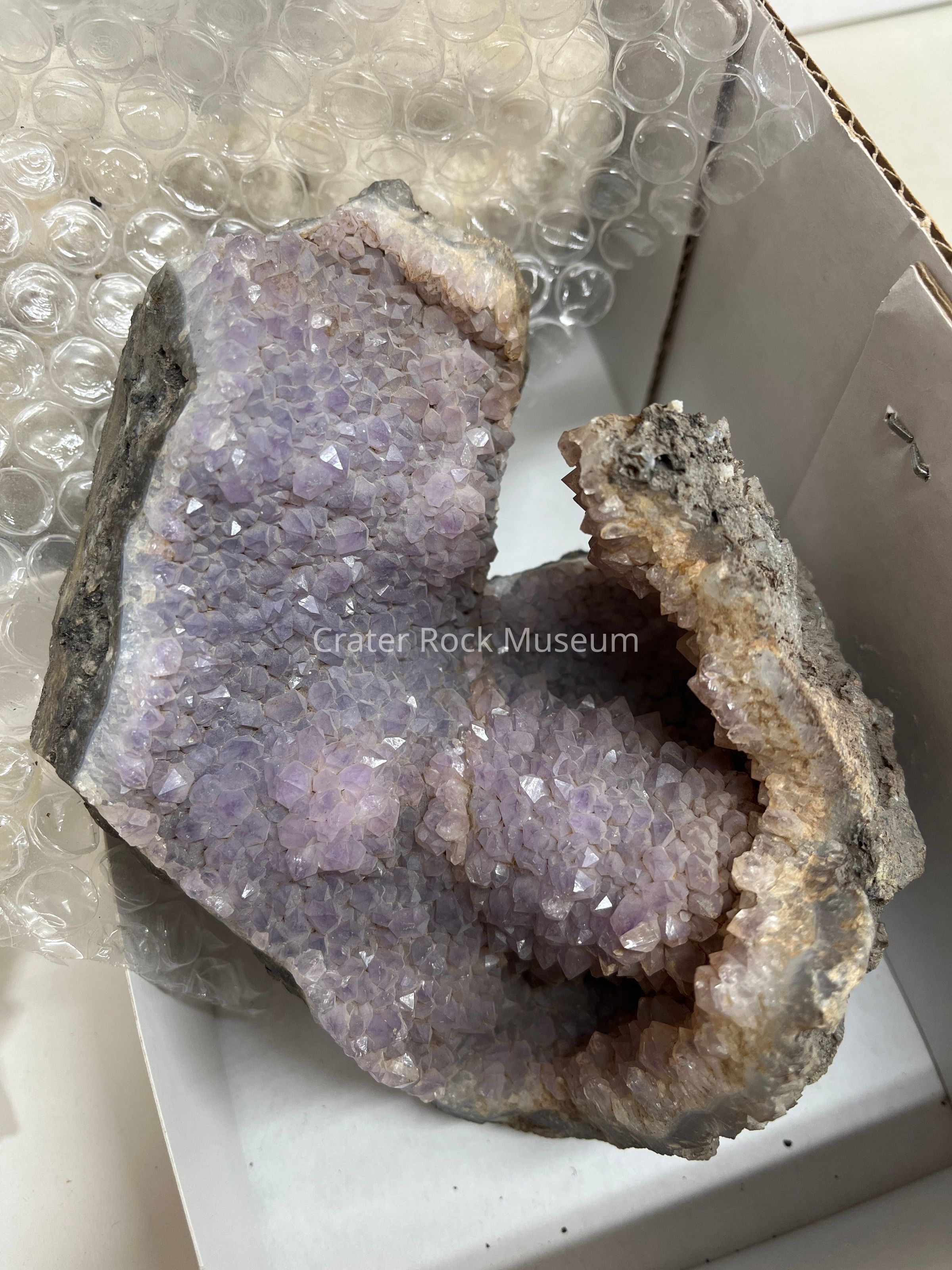 An Agate Nodule from Jackson County, OR. Broken side reveals Amethyst colored interior surrounded by a Grey Agate. Opaque rock is seen along one side (in Grey and Olive). Exterior shows Mustard colored Moss growing on outside (fragile).Dimensions