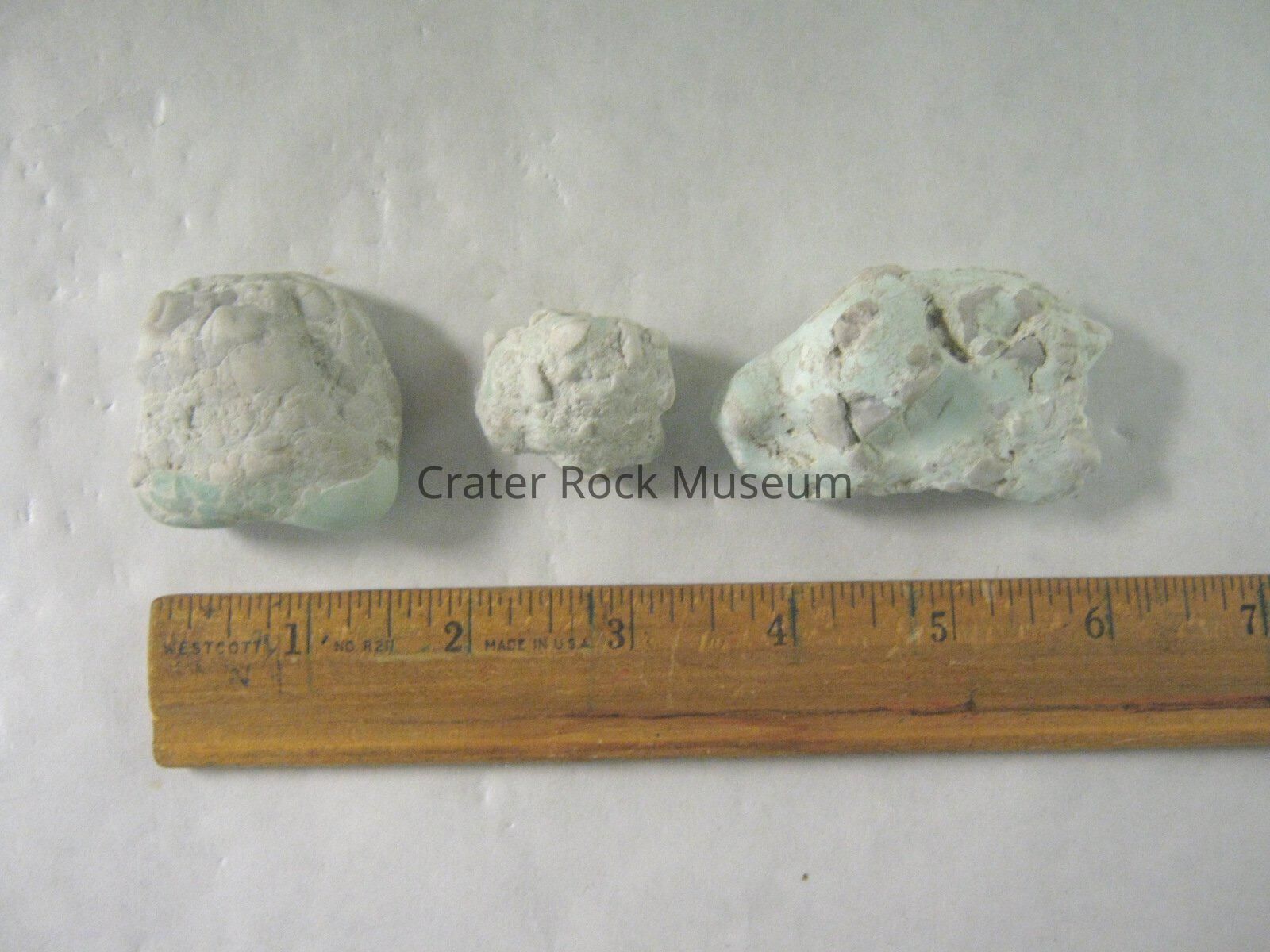 Description ; Three small uncut stones, smooth and nodular light green in color with a gray matrix.Collection