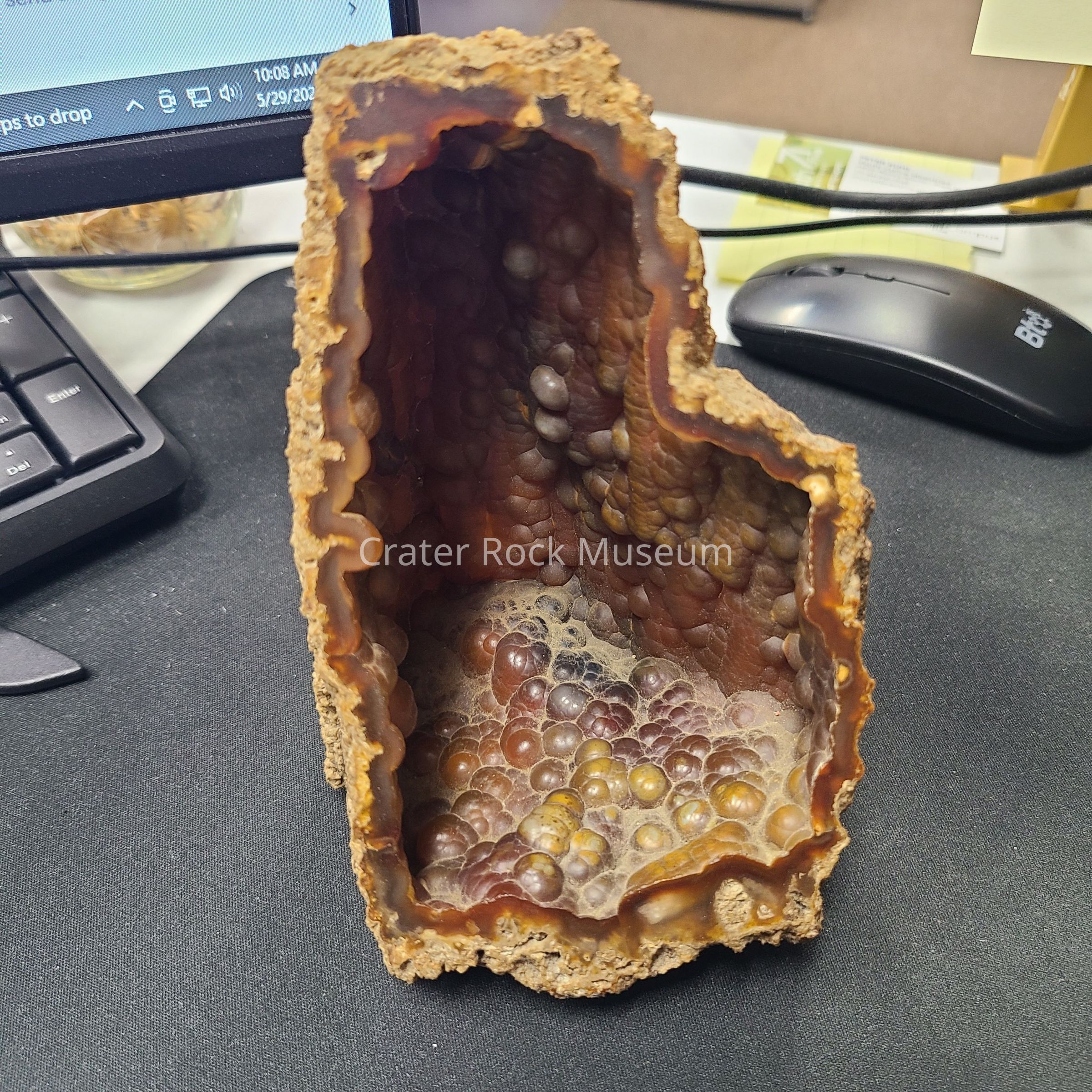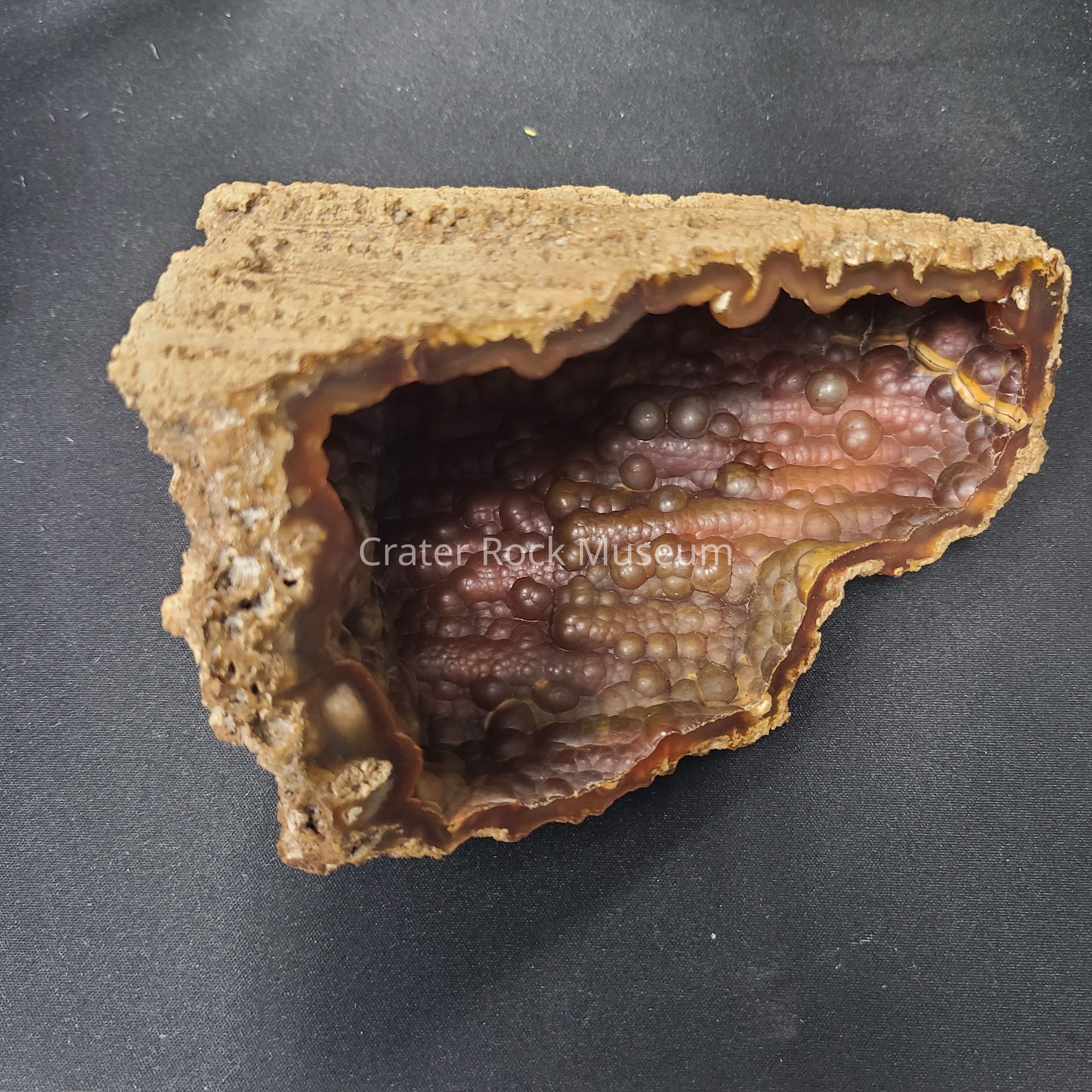 Small cathedral filled with orange, red, plum, and gold botryoidal agate
