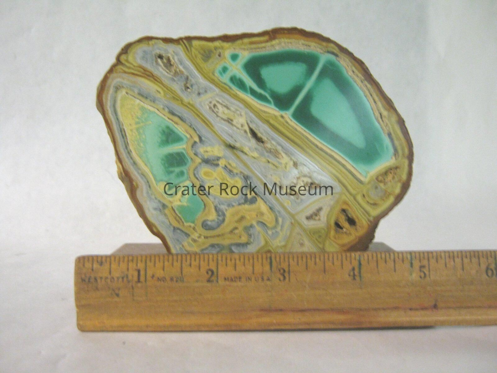 Description : Thick slab with a rounded back the polished face is colored a pale to dark green by the variscite and the matrix is grey to a tanish-yellow running throughout dividing the variscite into two sides.