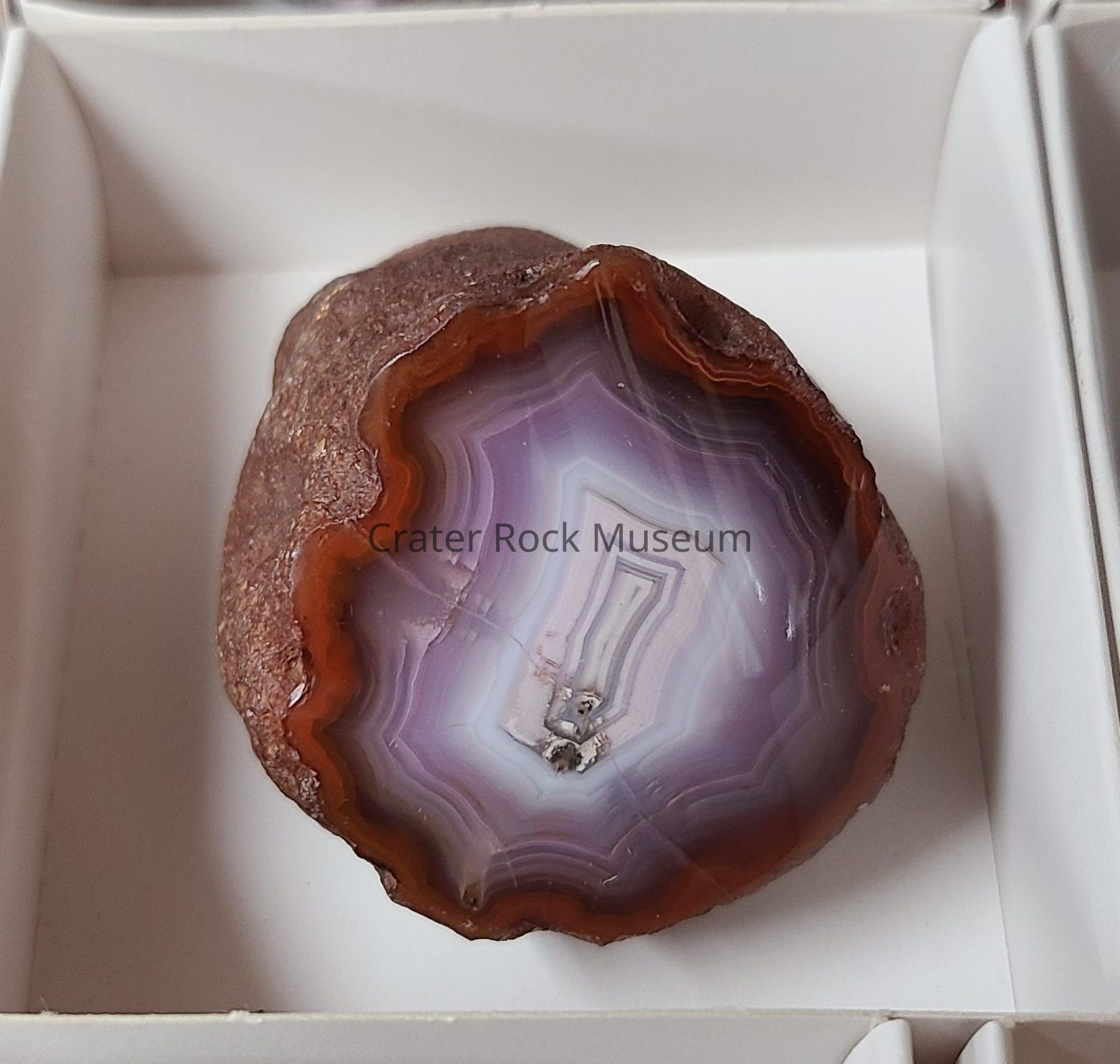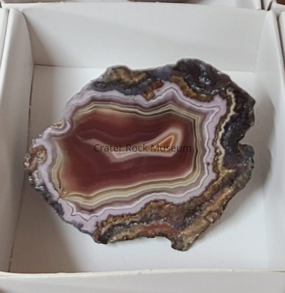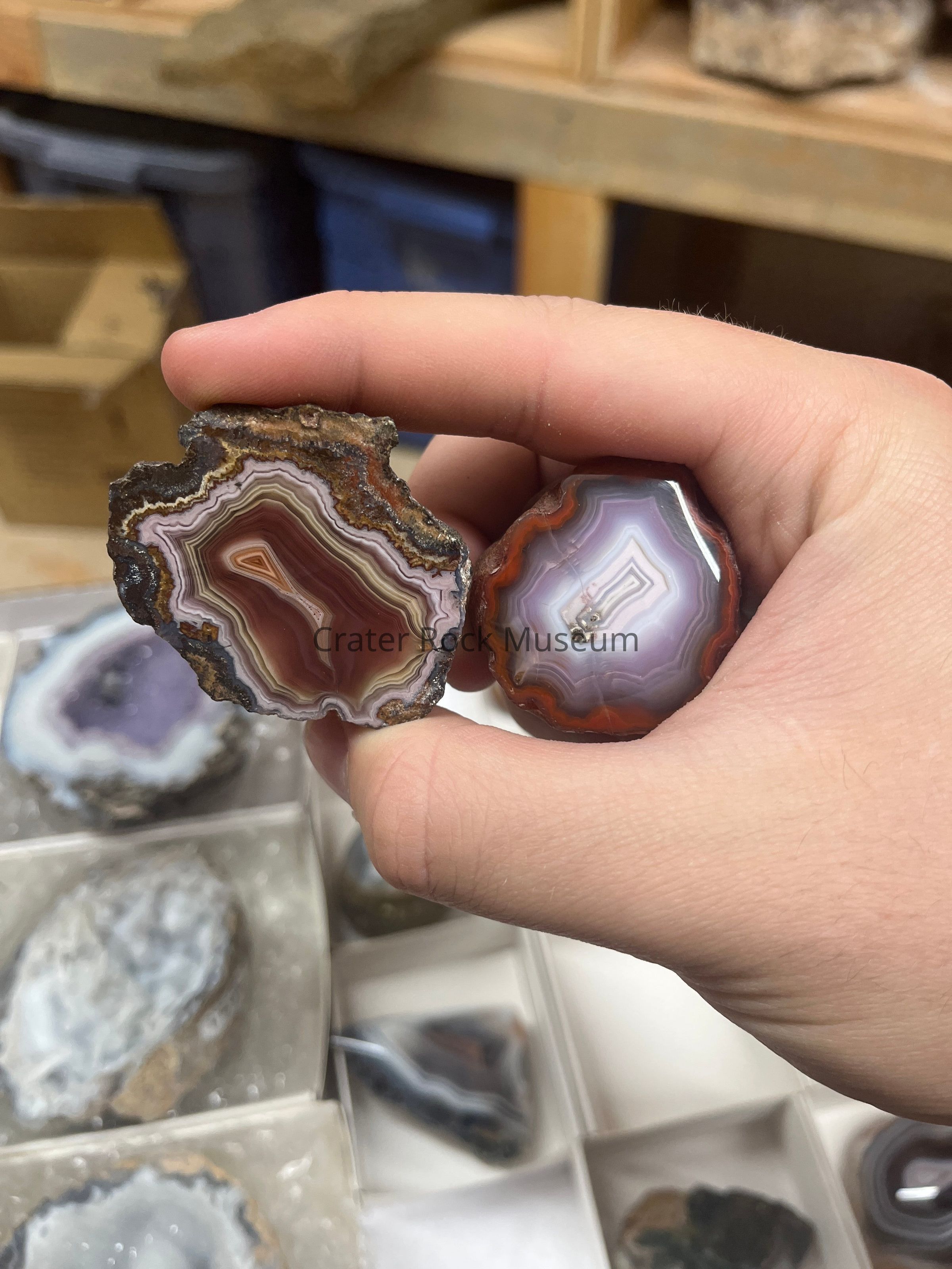 Three Agates from Luna, Mexico. Cut Sides show one is White open Crystalline lined interior with some Yellow surrounded by White and Clear Agate with Green Moss and Pinkish exterior; one is fortified in Lavender, Blue, Purple and Red with Red exterior and one with fortified Agate in Orange, Lavender, Red, Yellow with Blue, Yellow and Red outer rock.Dimensions