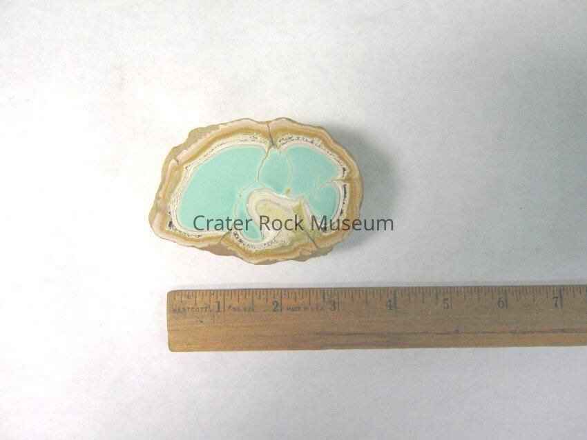Description : A thick rounded back slab with the polished face a solid pale green with a matrix outline of tanish-yellow.