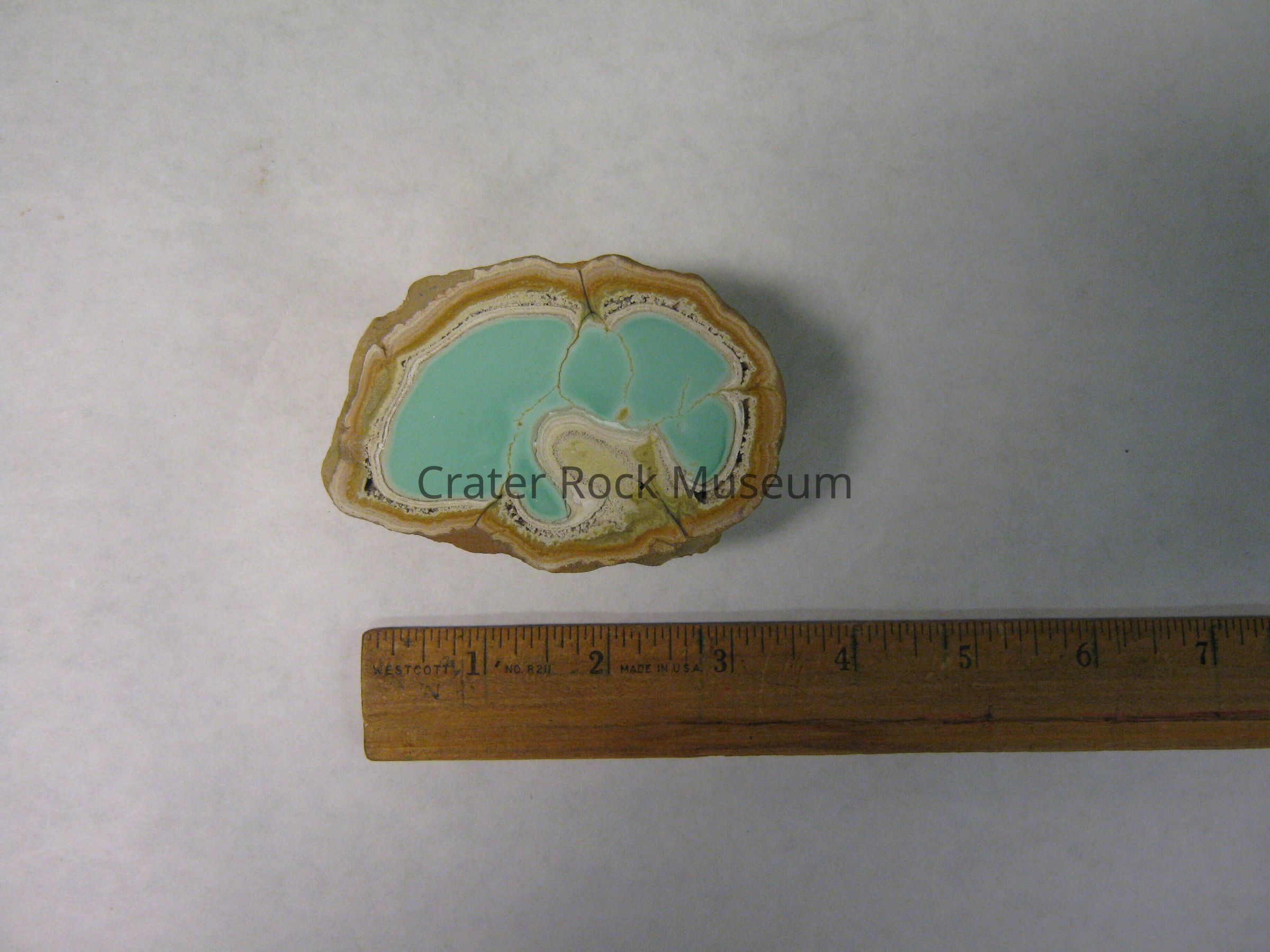 Variety: Variscite is a relatively rare phosphate mineral that is sometimes confused with turquoise. It is usually greener, however, than turquoise. Variscite is sometimes used as a semi-precious stone and can make distinctive color patterns that are very attractive. Occassionally it is altered into other phosphate minerals. This can occur in what were perhaps weak layers of a nodule since only portions of the variscite nodules are altered. The most common alteration mineral is crandallite, CaAl3(PO4)2(OH)5-H2O, and gives some nodules a yellow or white layer.Collection