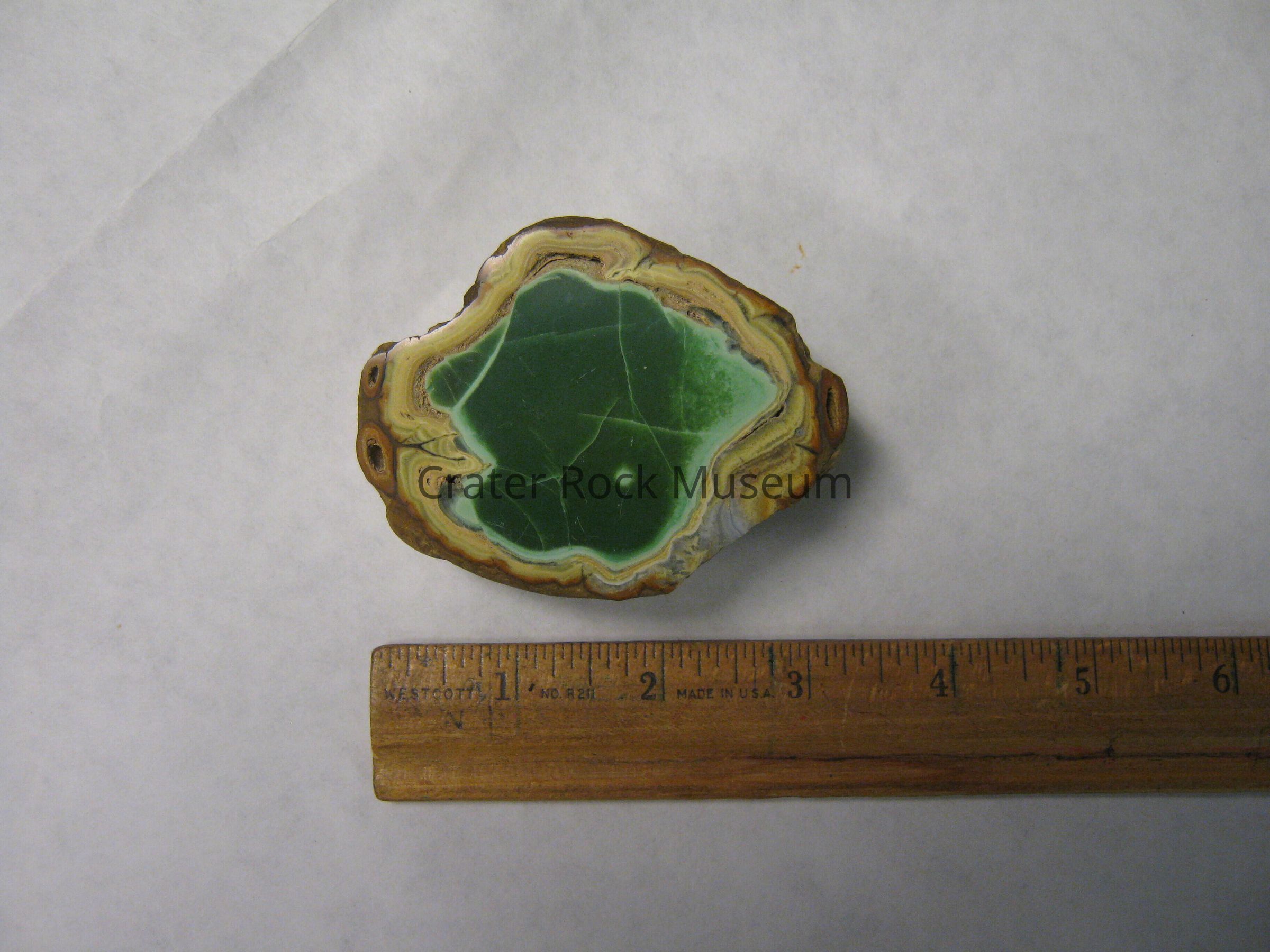 Description : Small slab with a rounded back and the polished face is a dark green with a outlined band of yellow to tan matrix.