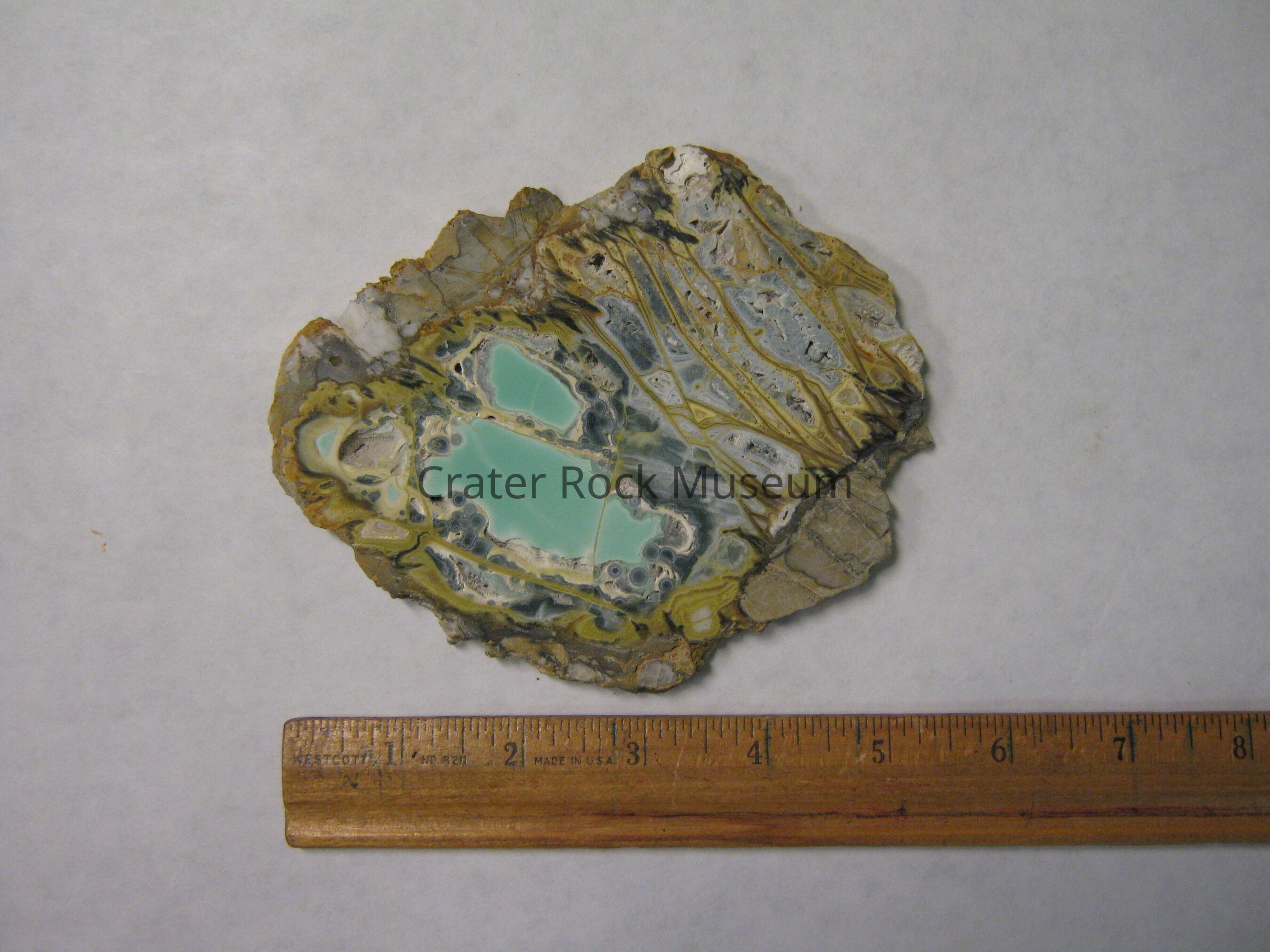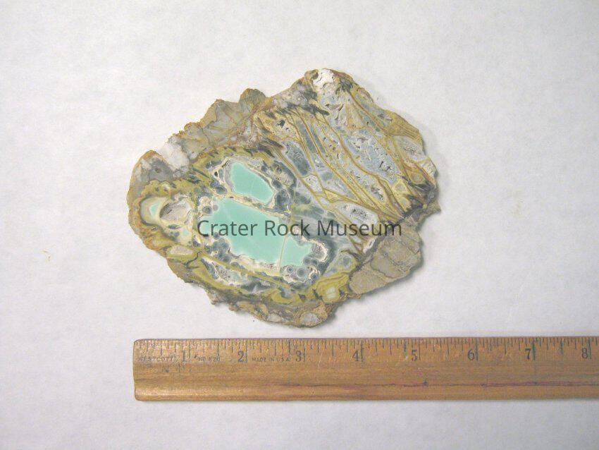 Description :Thin slab with polished face has a two small sections of pale green variscite surrounded by a white to gray matrix with yellow streaking off to one side.