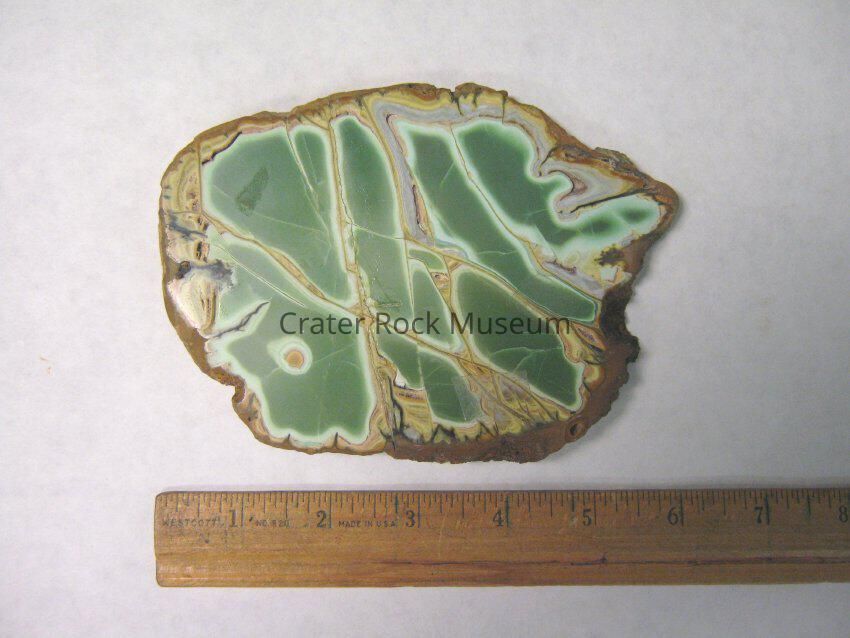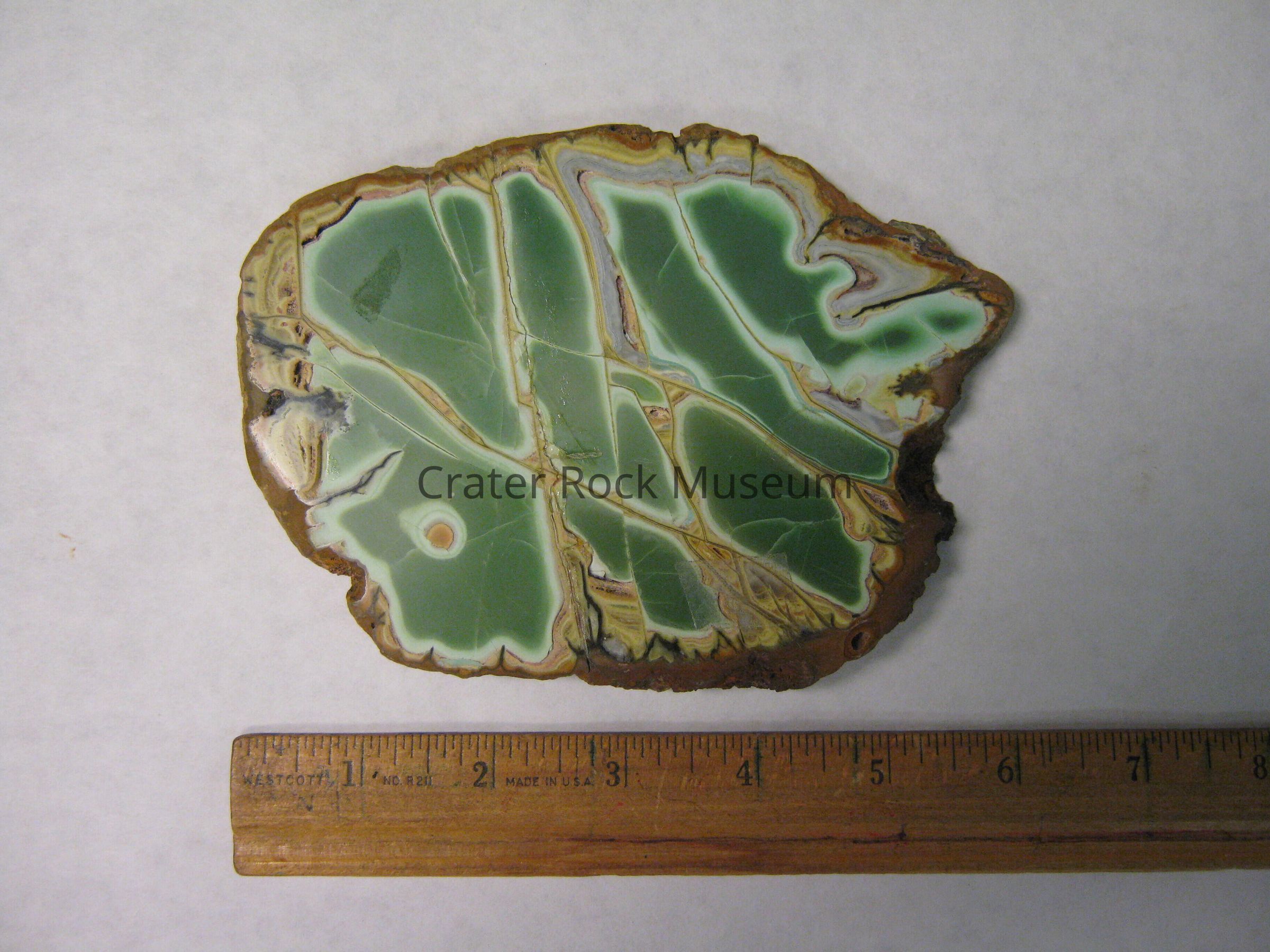Description : Thin slab with a polished face colored dark green surrounded by a greenish-white bands of variscite with the outer matrix a tanish-yellow to brown.