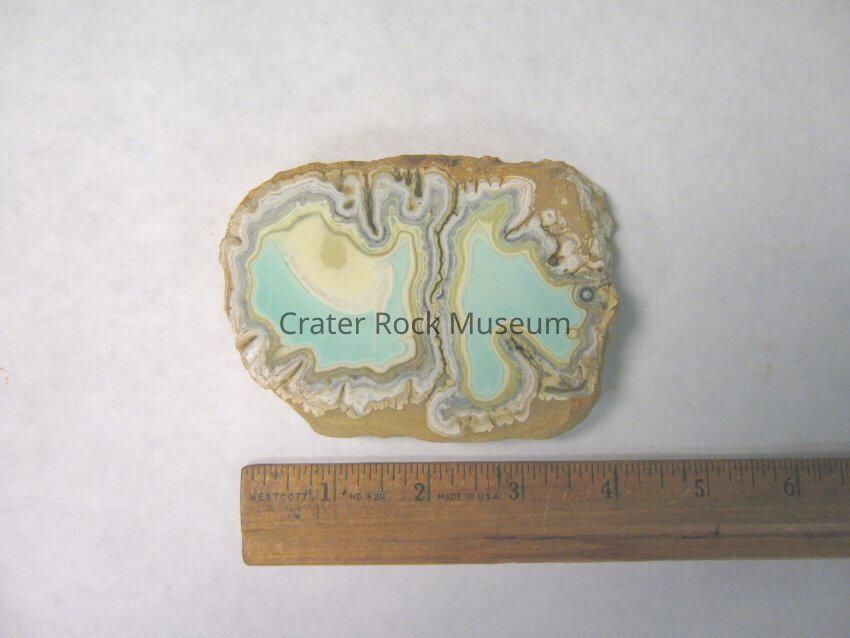 Description : Thin slab with polished face with two sections of pale green to yellow variscite with the matrix tanish-yellow to gray and some orange banding on the outer-layer.
