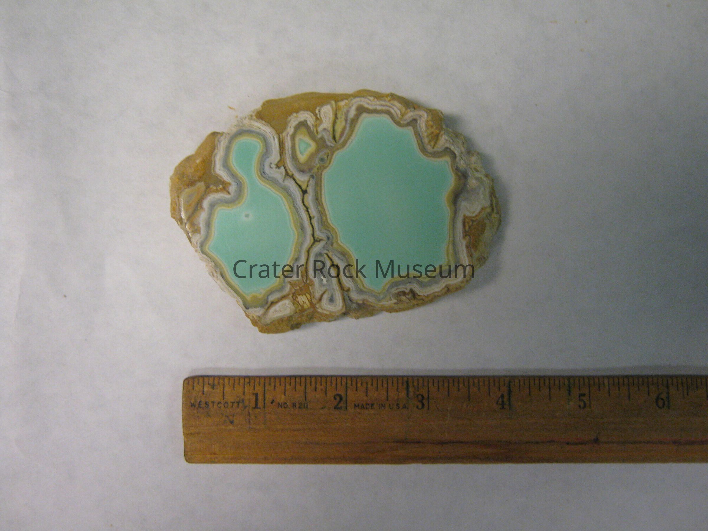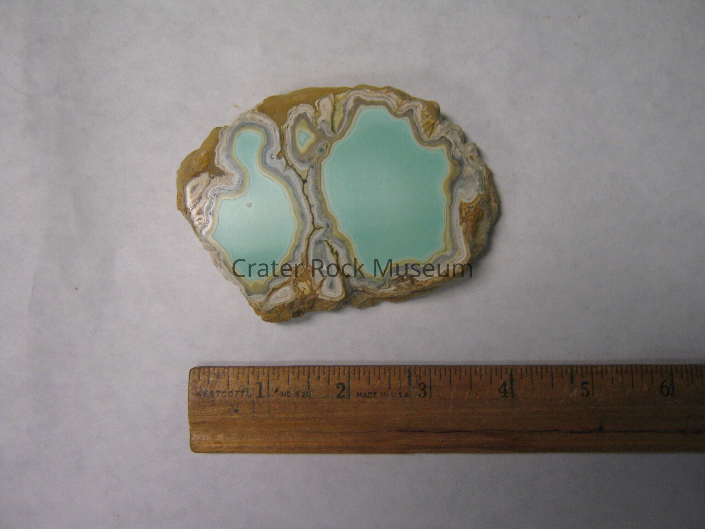 Description : Thin slab with polished face colored pale green patches surrounded by tanish-yellow to gray matrix.