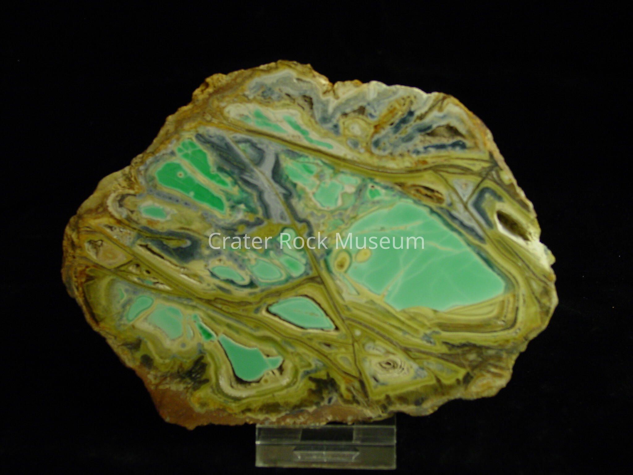 Variety: Variscite is a relatively rare phosphate mineral that is sometimes confused with turquoise. It is usually greener, however, than turquoise. Variscite is sometimes used as a semi-precious stone and can make distinctive color patterns that are very attractive. Occassionally it is altered into other phosphate minerals. This can occur in what were perhaps weak layers of a nodule since only portions of the variscite nodules are altered. The most common alteration mineral is crandallite, CaAl3(PO4)2(OH)5-H2O, and gives some nodules a yellow or white layer.Collection