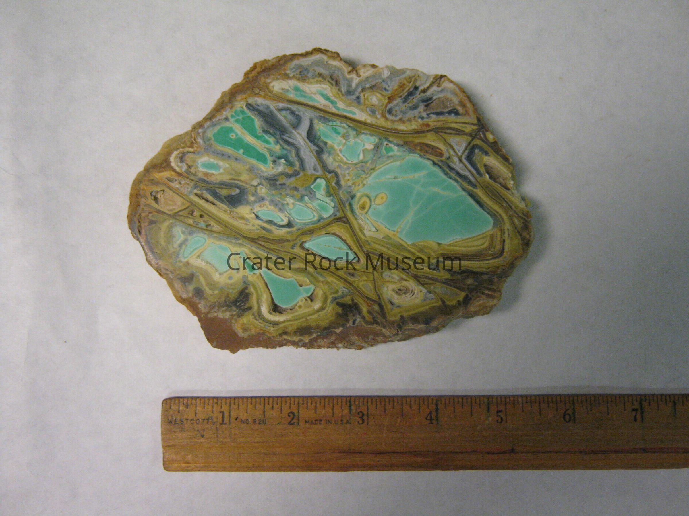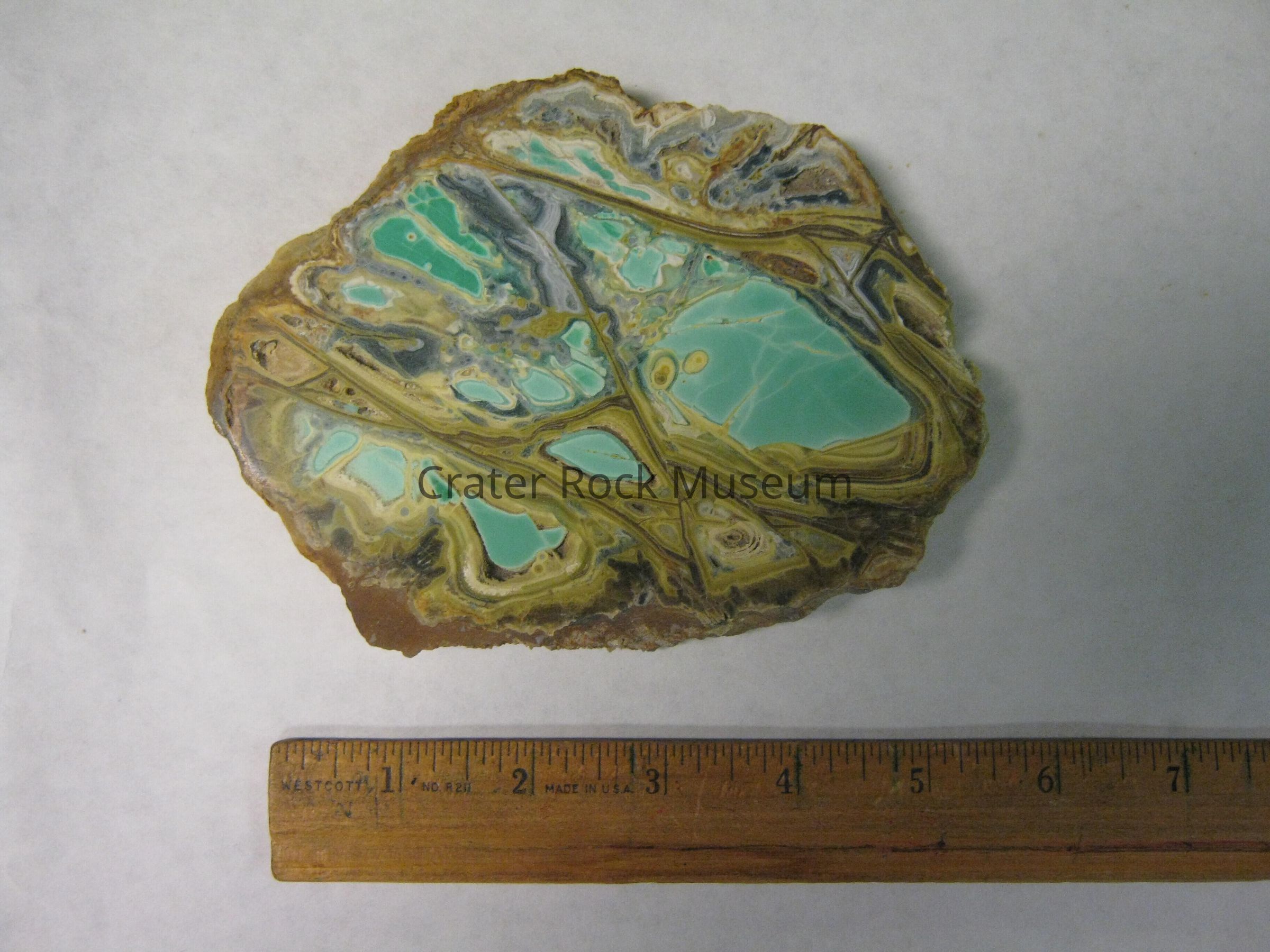 Description : Thin slab with a polished face with small areas of variscite colored pale to darker green with the matrix streaked throughout the specimen with yellowish brown and gray.