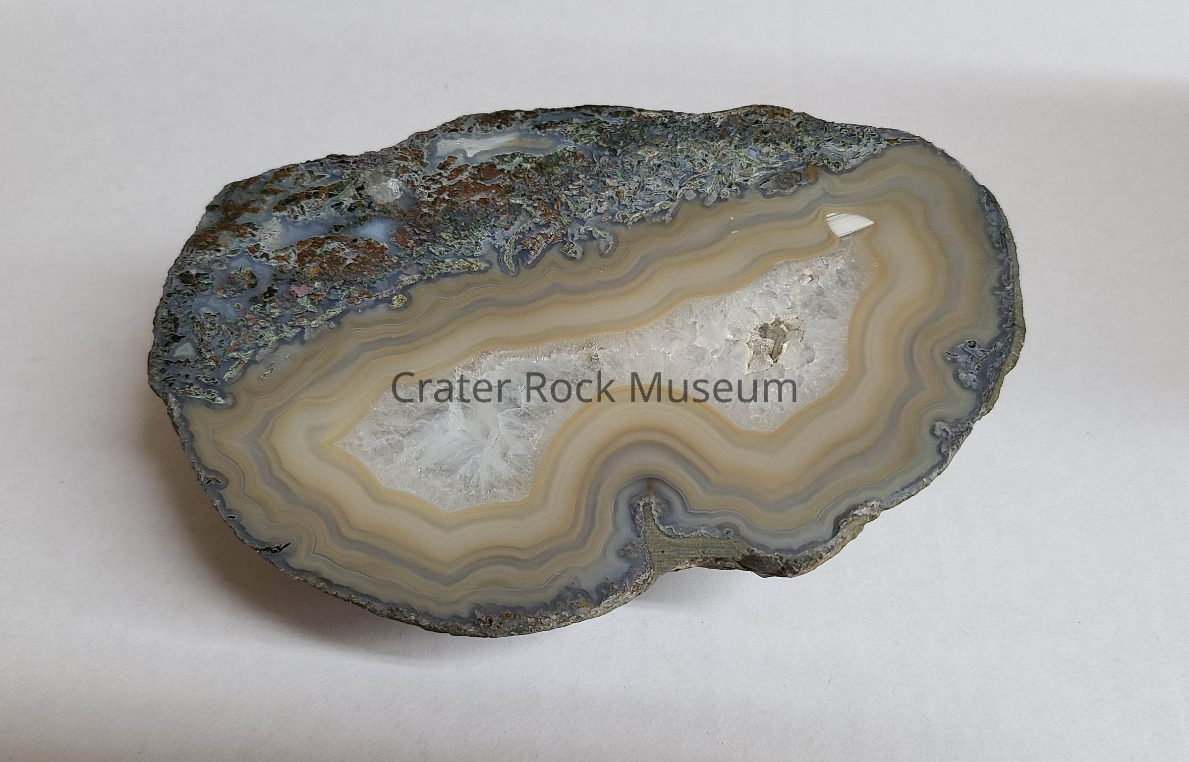 An Agate from Beacon Hill, Weiser, ID. Cut side shows fortified Agate with Crystalline center in Beiges and Light Blues, Brown, Green and Blue Moss is seen along one third of Nodule and a little along edges. A White bedding spot is seen to side of Crystalline area. Fortified and Crystalline area reveals two connected chambers.Dimensions