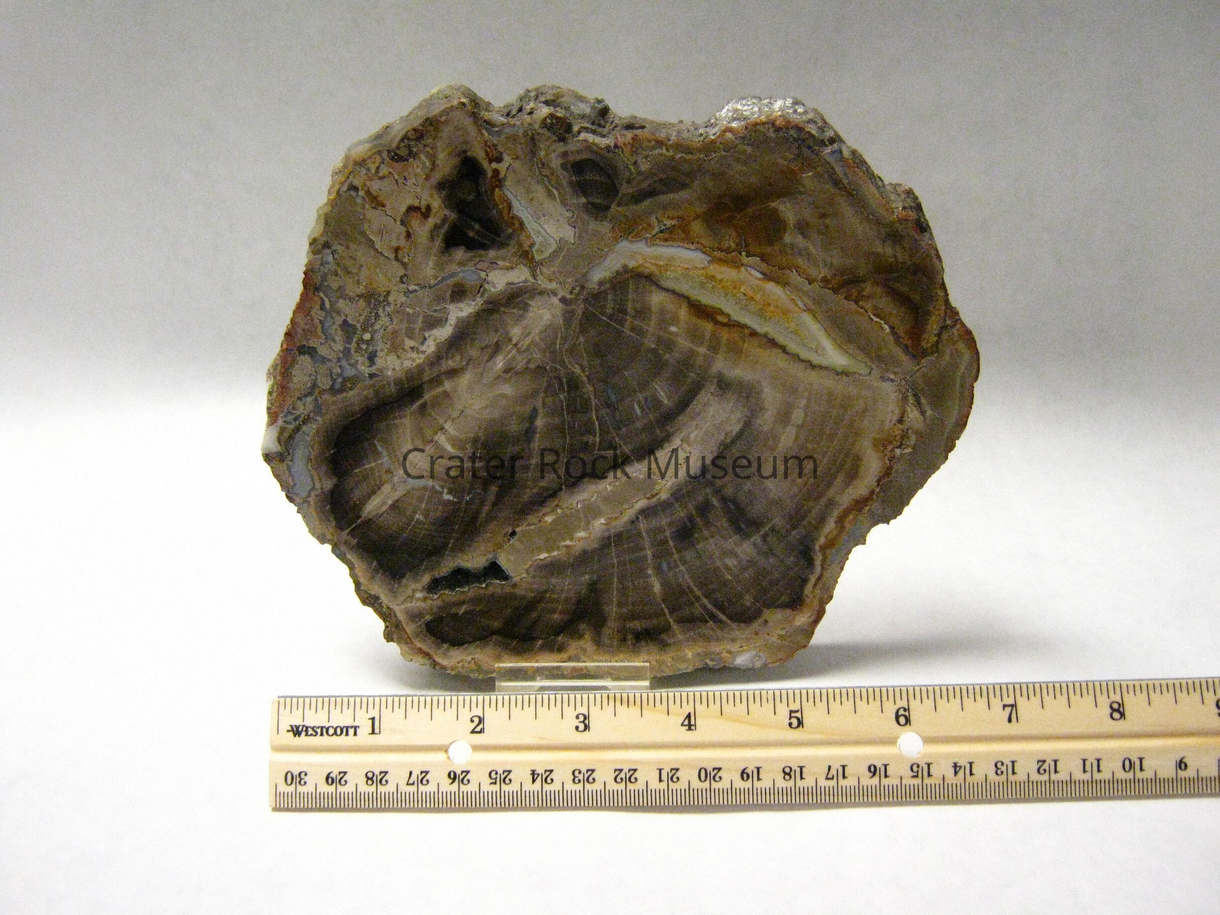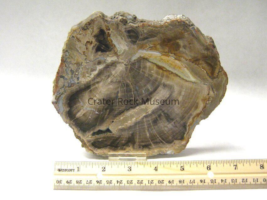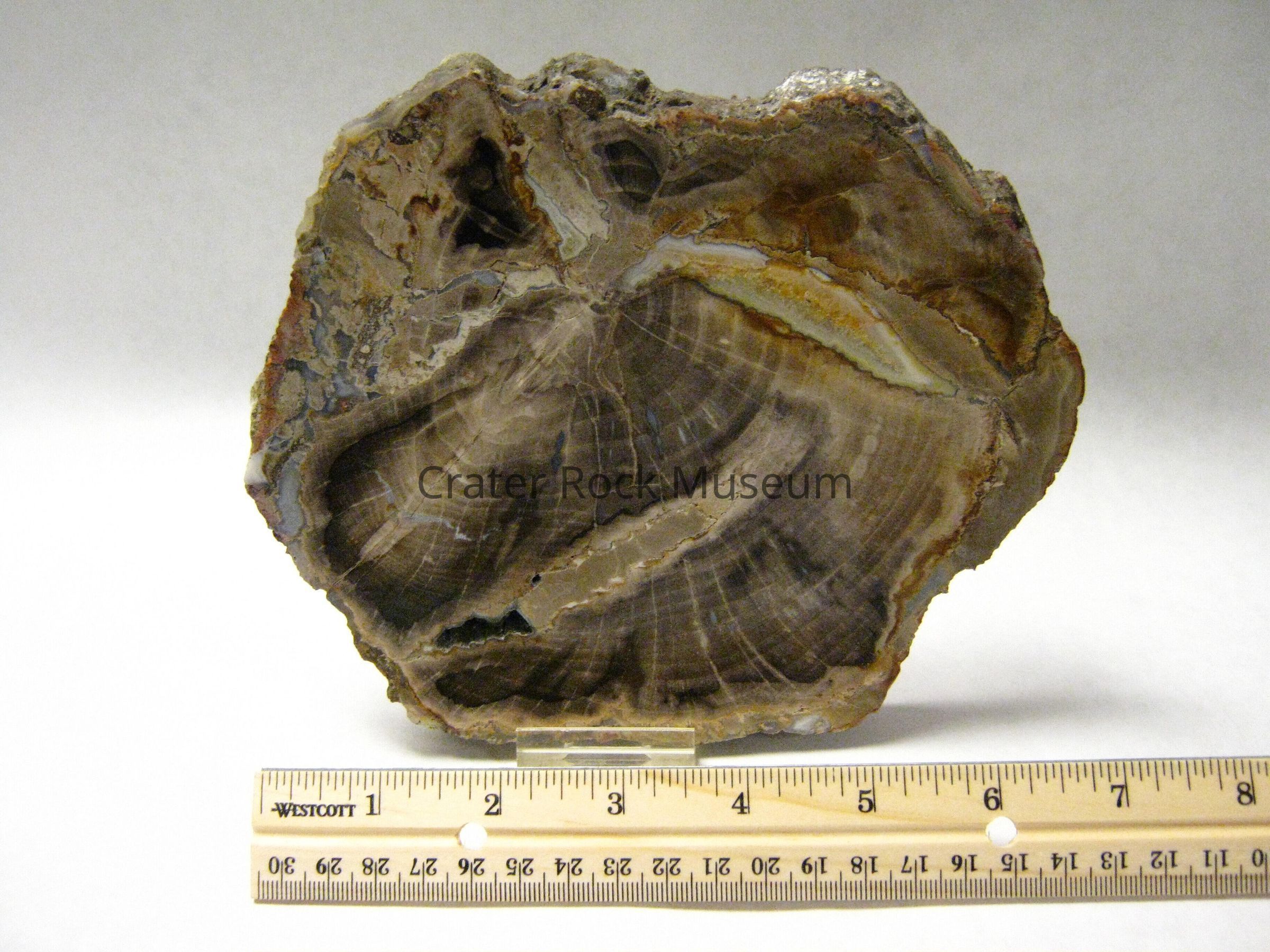 Description: Delmar describes this piece as a thick slice of petrified wood in which the polished side shows wood in beiges, golds, browns and some black with grey , white and crystalline silicate fillers. There are two large silicate cracks seen. Growth rings are visible. Possibly a non-tropical tree. Doug Foster describes this specimen as Laurel-like.