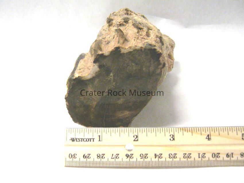 Description: Specimen has light tans and a dark brown streak running the full length of the outer areas. One end is cut and polished revealing a tight grouping of growth rings light tan, beige and light brown in color.