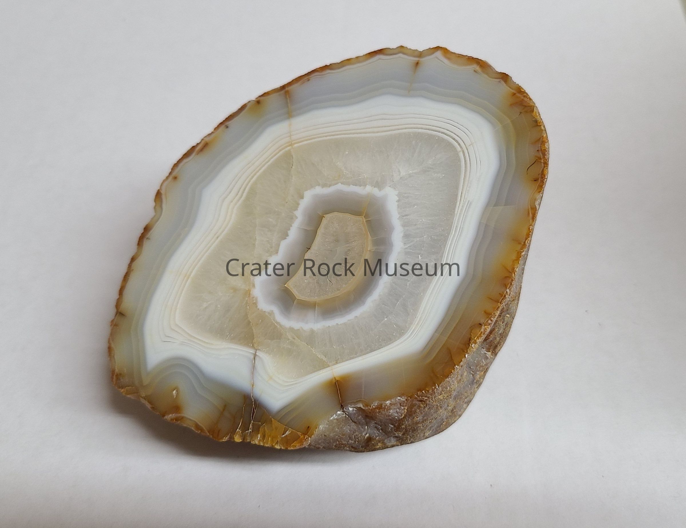 An Agate from Bear Creek, Jackson County, OR. Cut side shows fortified Agate with Crystalline center with Cream then Grey then White, Crystalline, Whites, Greys to Brown at outer rim. Several cracks present, some surface. Fortification bands obvious on uncut side of Agate.Dimensions