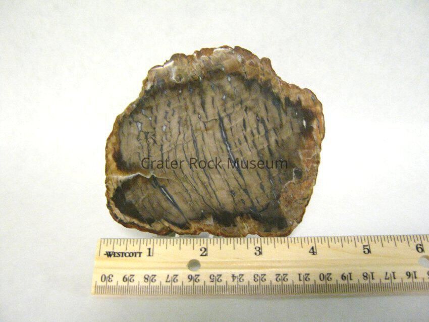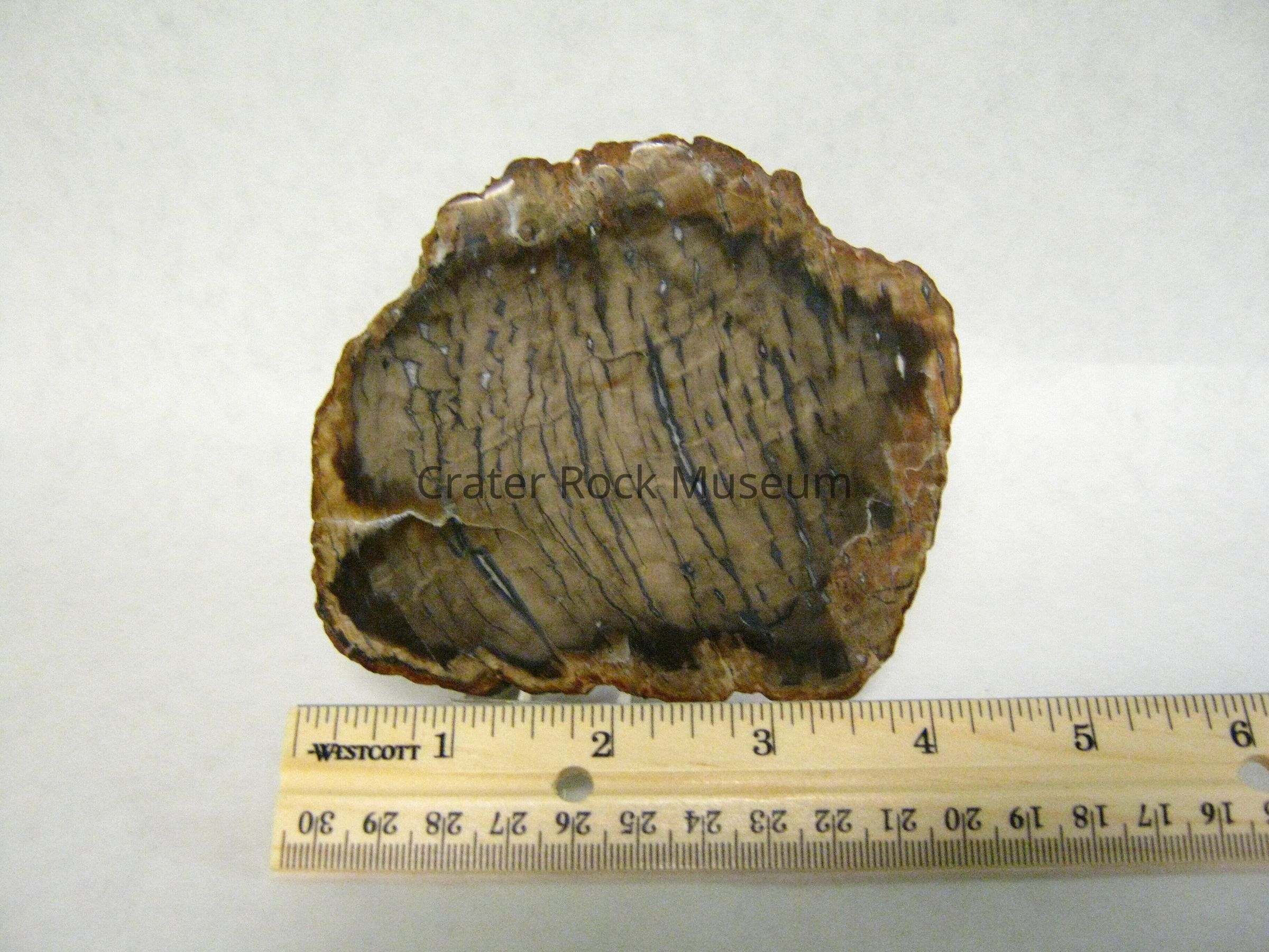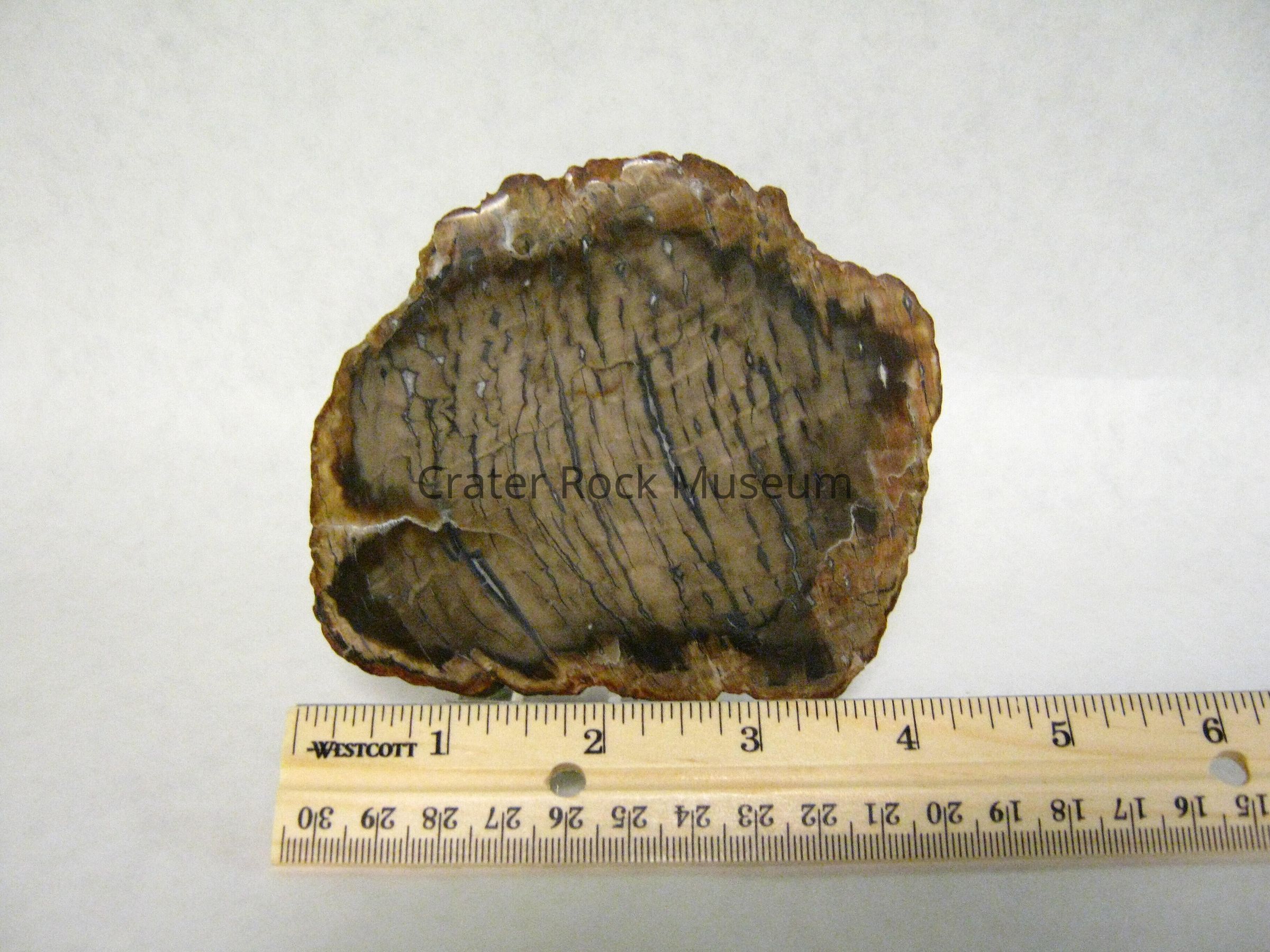 Description: Polished side shows wood in browns and tans with silicate filled cracks. Piece is cut with grain.