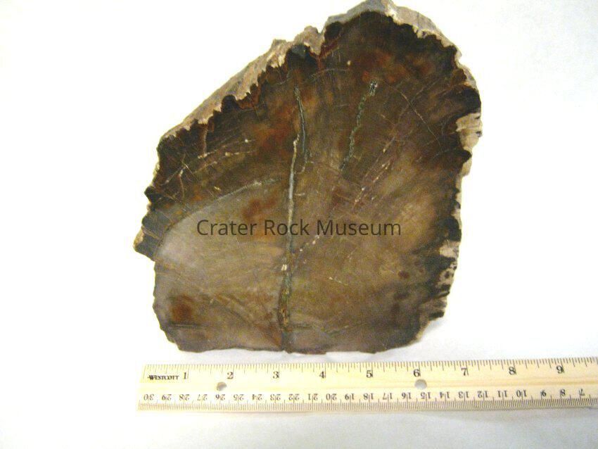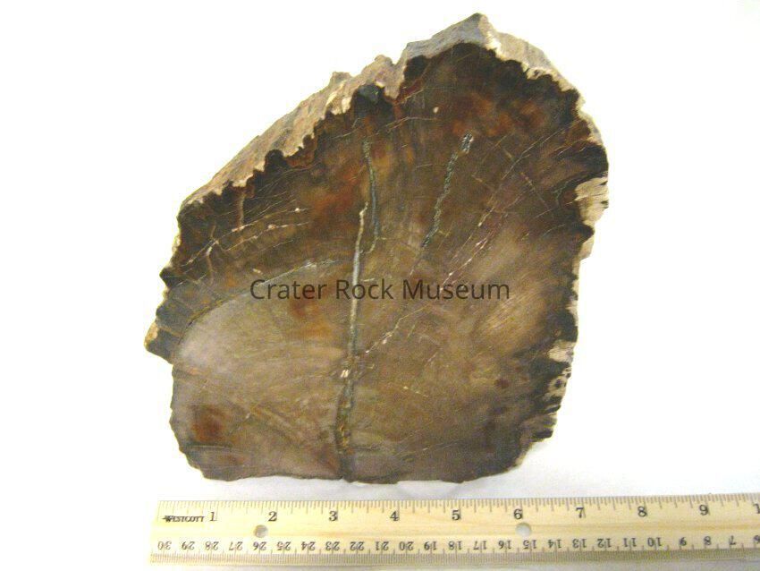 Description: A partially round thick slab with a polished face. Brown and tan face with agate vein striations throughout.