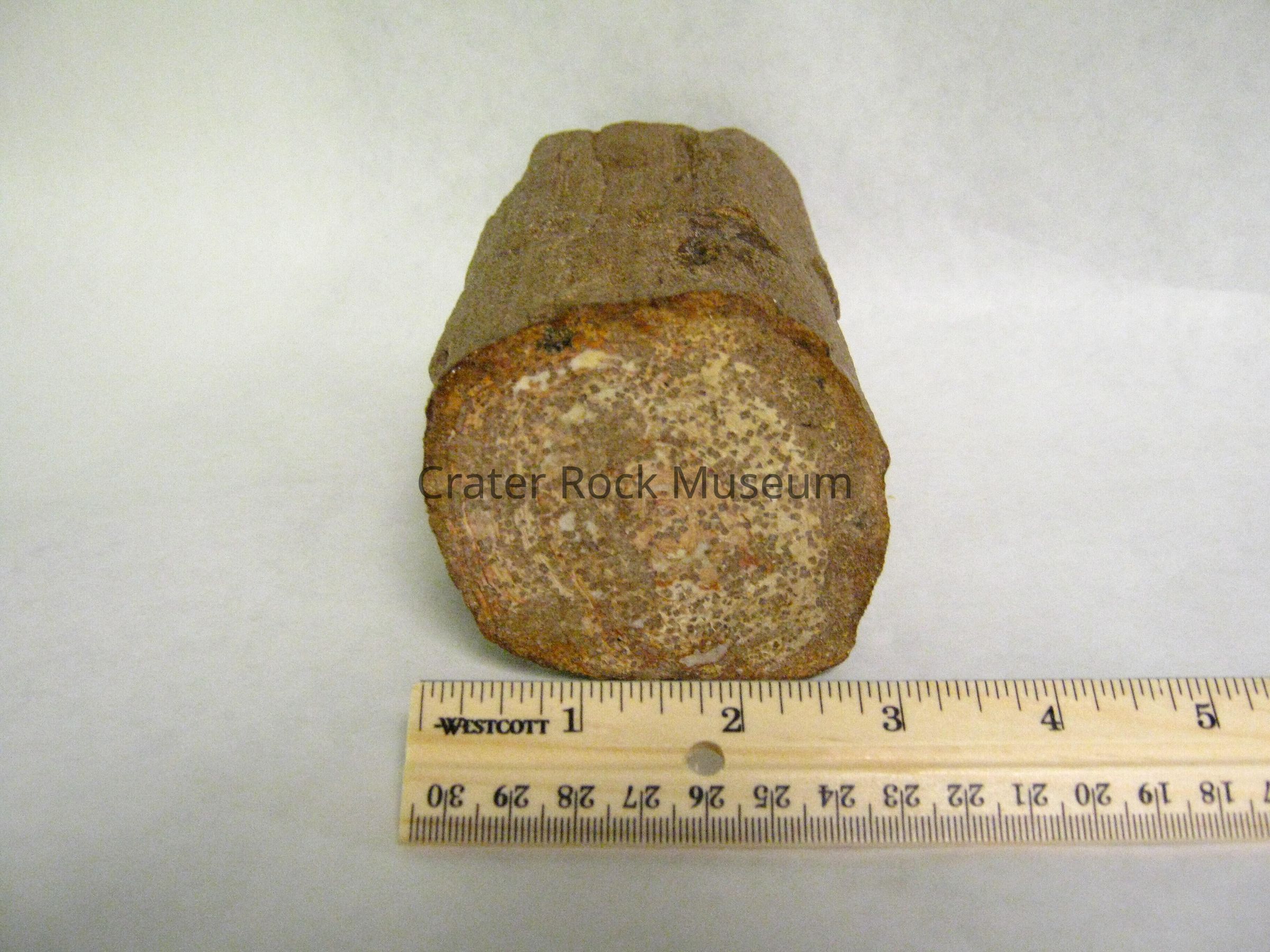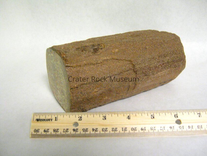 Description: A small branch colored brown. Pseudomorph of quartz. Silica replaced halite crystals of salt making the wood species un-identifiable.