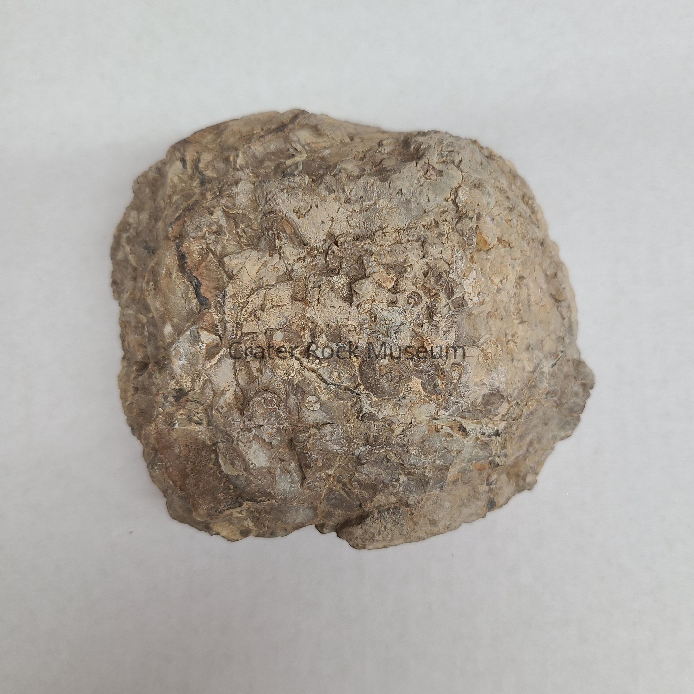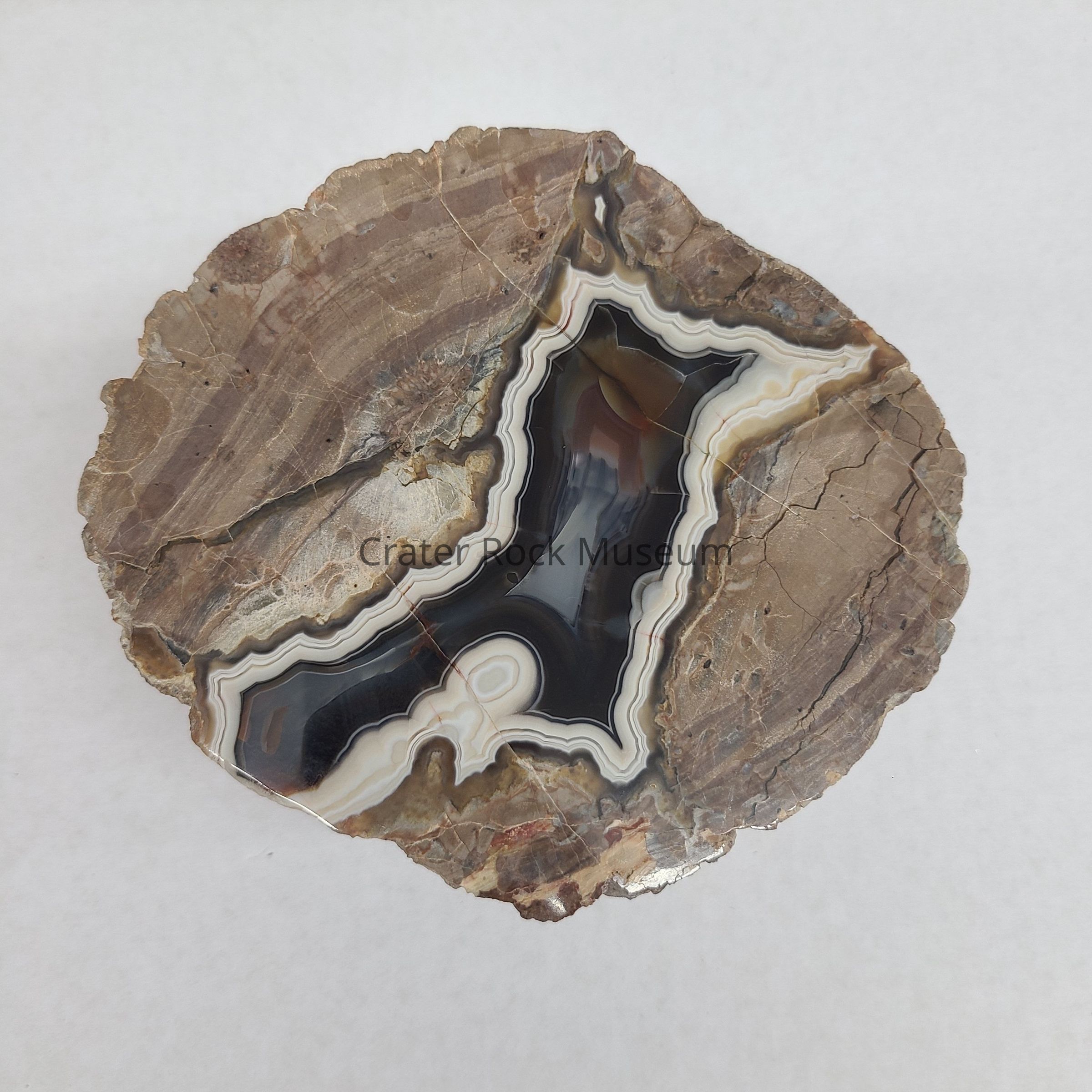 A Thunderegg from Deming, NM. Cut side shows fortified Agate center in Red, Grey, Black, Orange, White and Creams surrounded by Clear Agate in a Pinkish Grey and Greenish striped rock. Numerous Cracks seen.Dimensions
