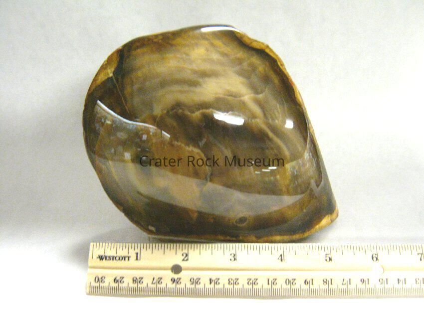 Description: This is a thick specimen with a convex, polished surface. Coloring is brown, tan, orange, grey and black.
