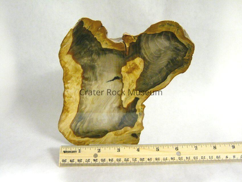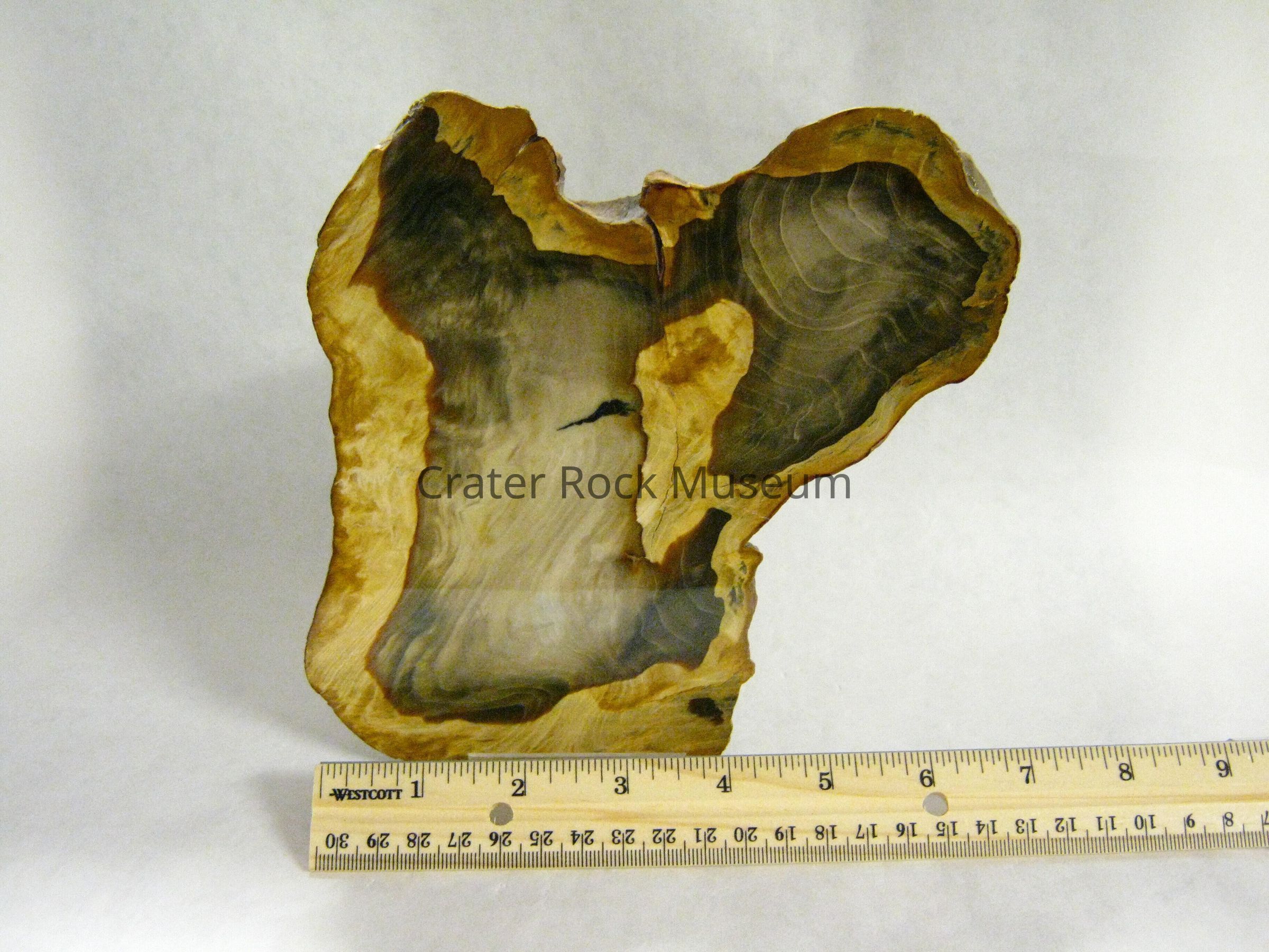 Description: This is a thick specimen with a triangular shape with a beveled polished face. Colors are grey, cream, gold, and browns. There is a couple of thick bands surrounding a beige streaked center.
