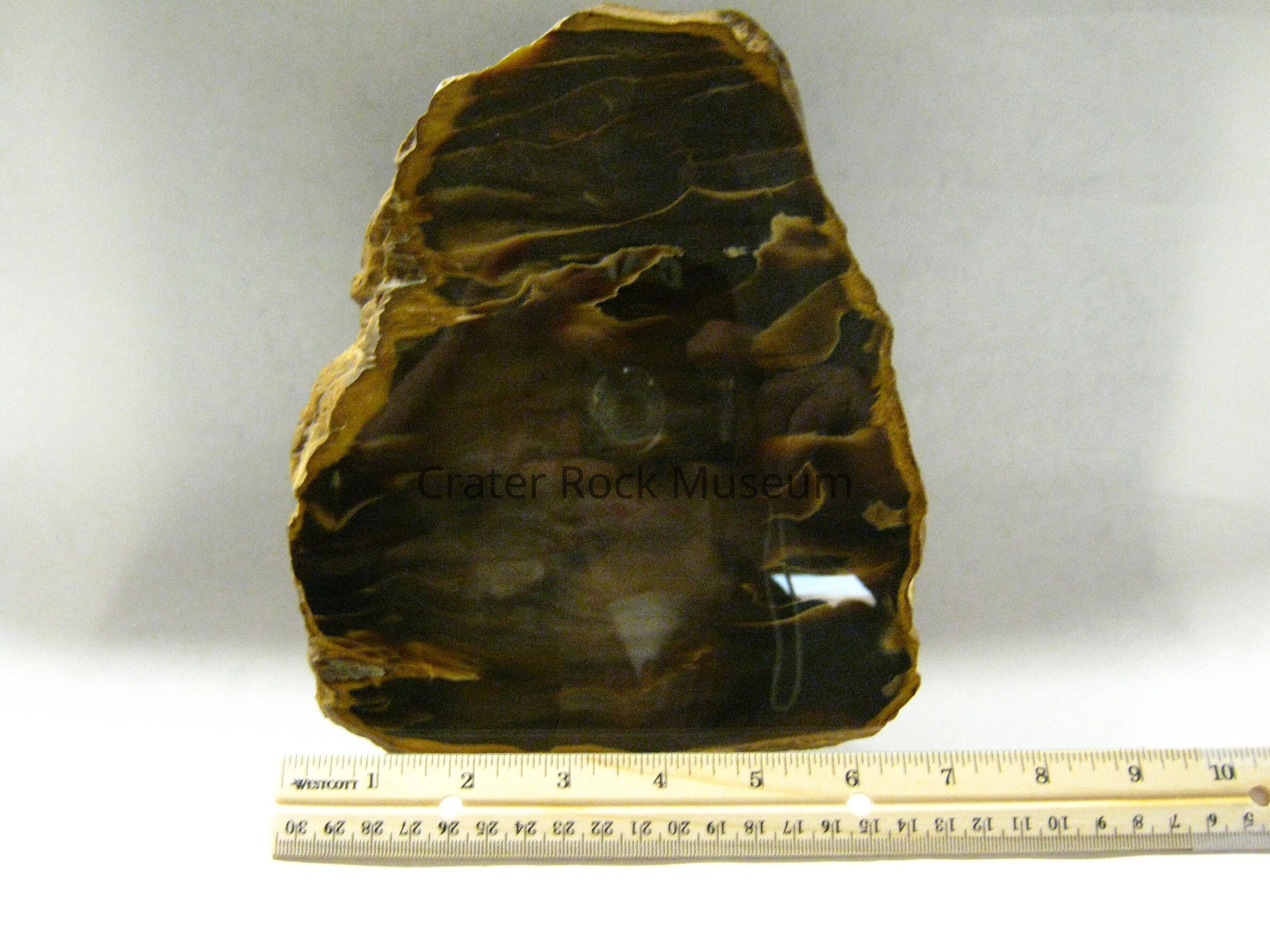 Description: Thick slice with polished face. Dark brown with gold along edges and a through piece. Grain is visible.