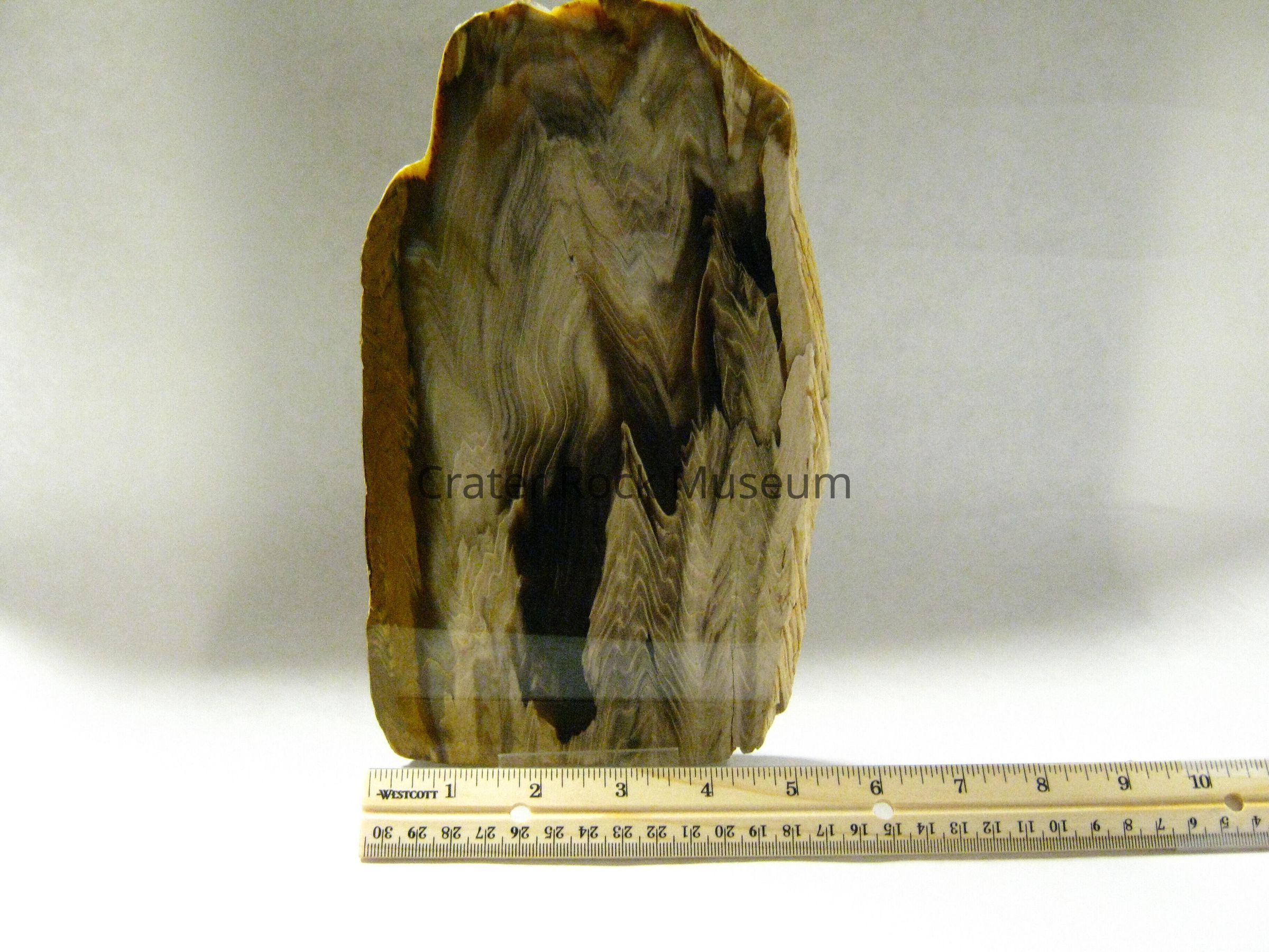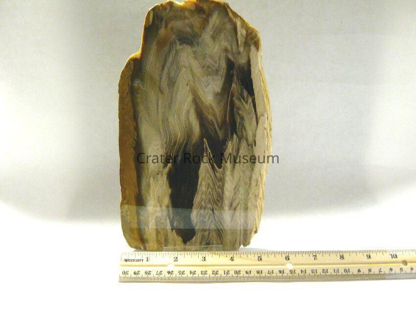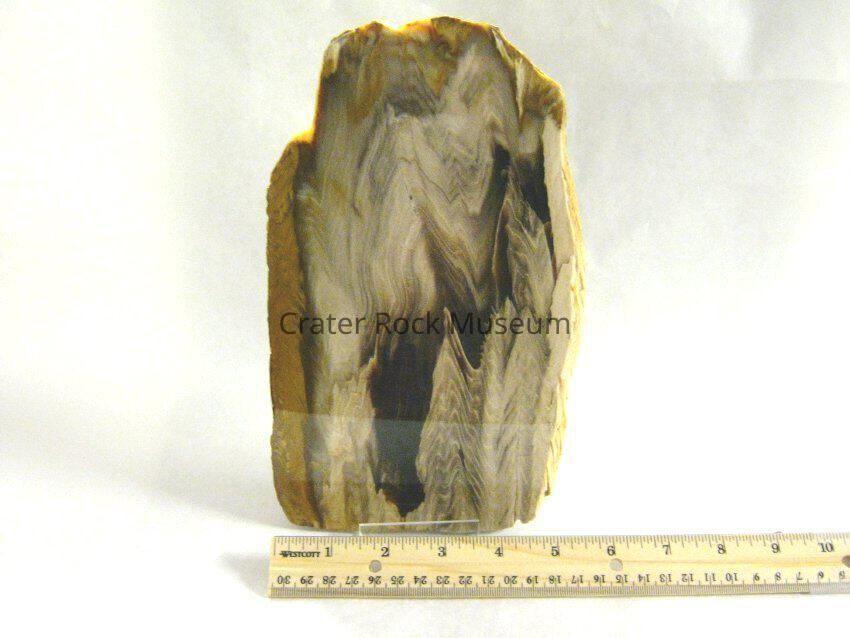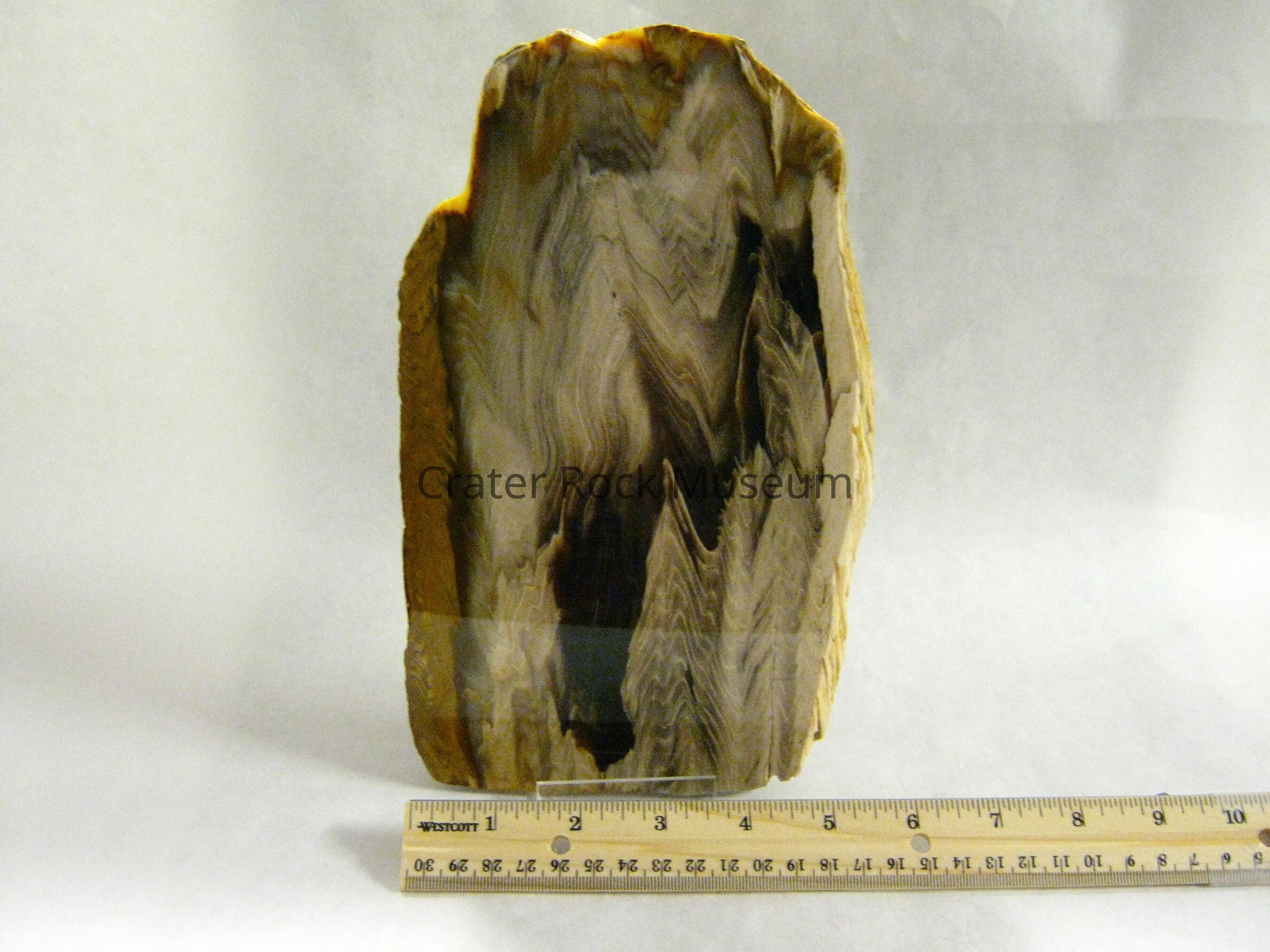 Description: Thin slice with two polished sides. Coloring is tan, gold ,brown, black and some grey.