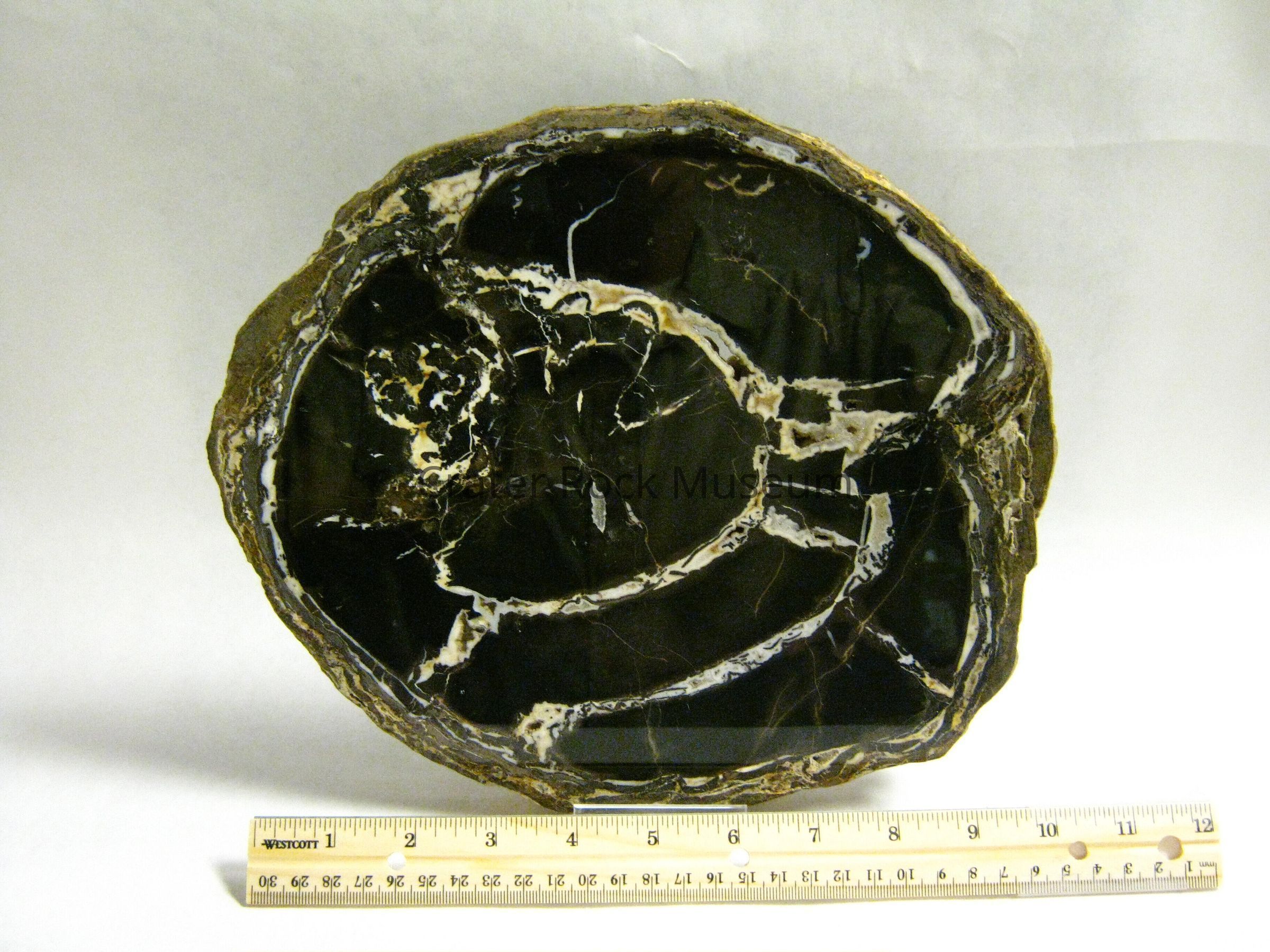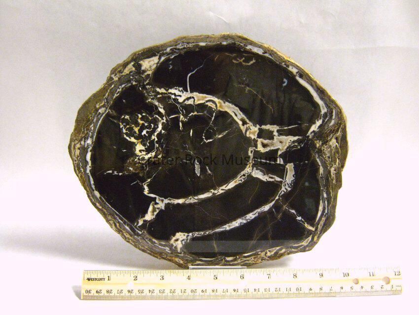 Description: Delmar describes this specimen as a petrified limb from Prineville, Oregon. The polished end shows black wood with some grey agate. A beige spot is to one side. Growth rings are visible. Walt Wright claims this specimen is from the Tecter Ranch in Post, Oregon.