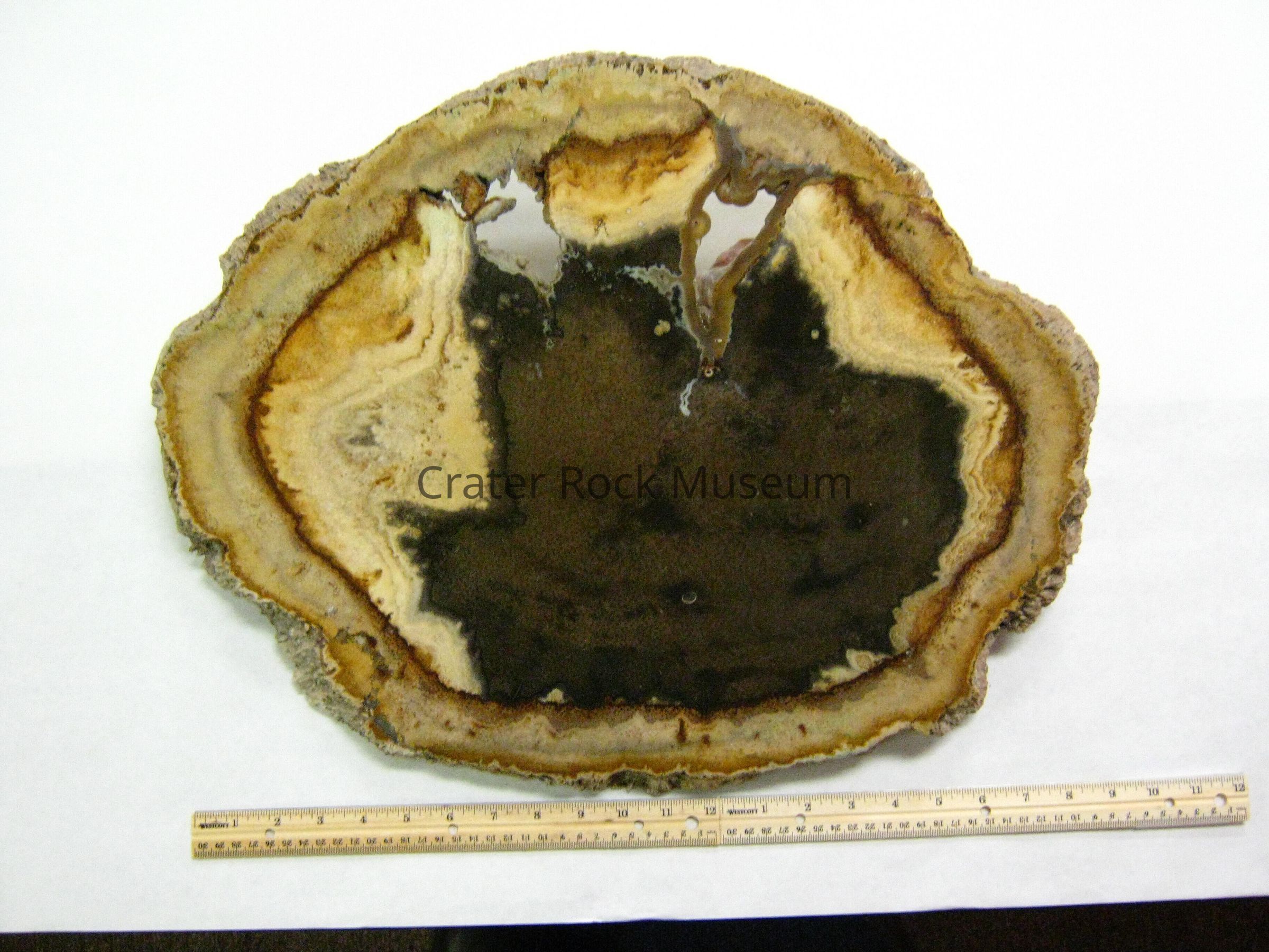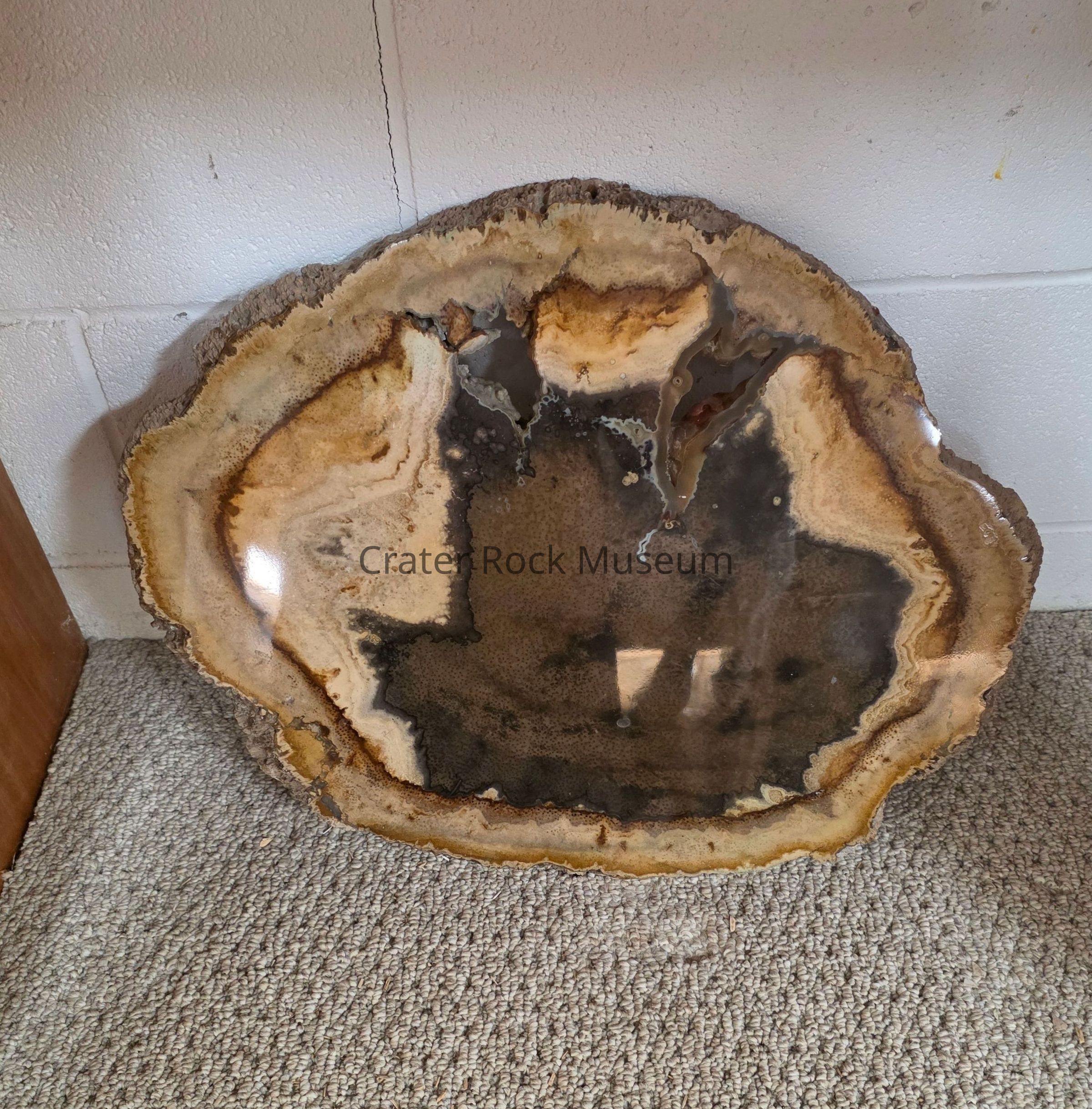 Description: Delmar Smith describes this specimen as a thick slice with two polished sides, one having a central dark zone in dark brown and black, surrounded by yellow and gold wood, then a brown band, and then gold and mustard at outer edge. Two large open holes at one side. One contains red colored rock.