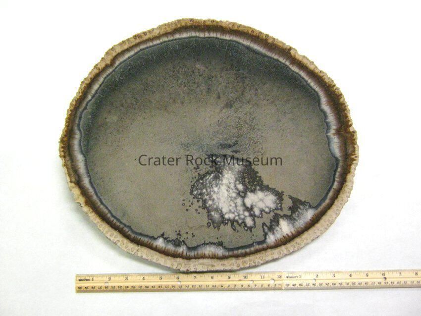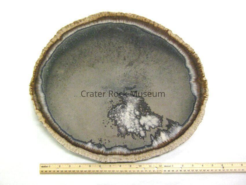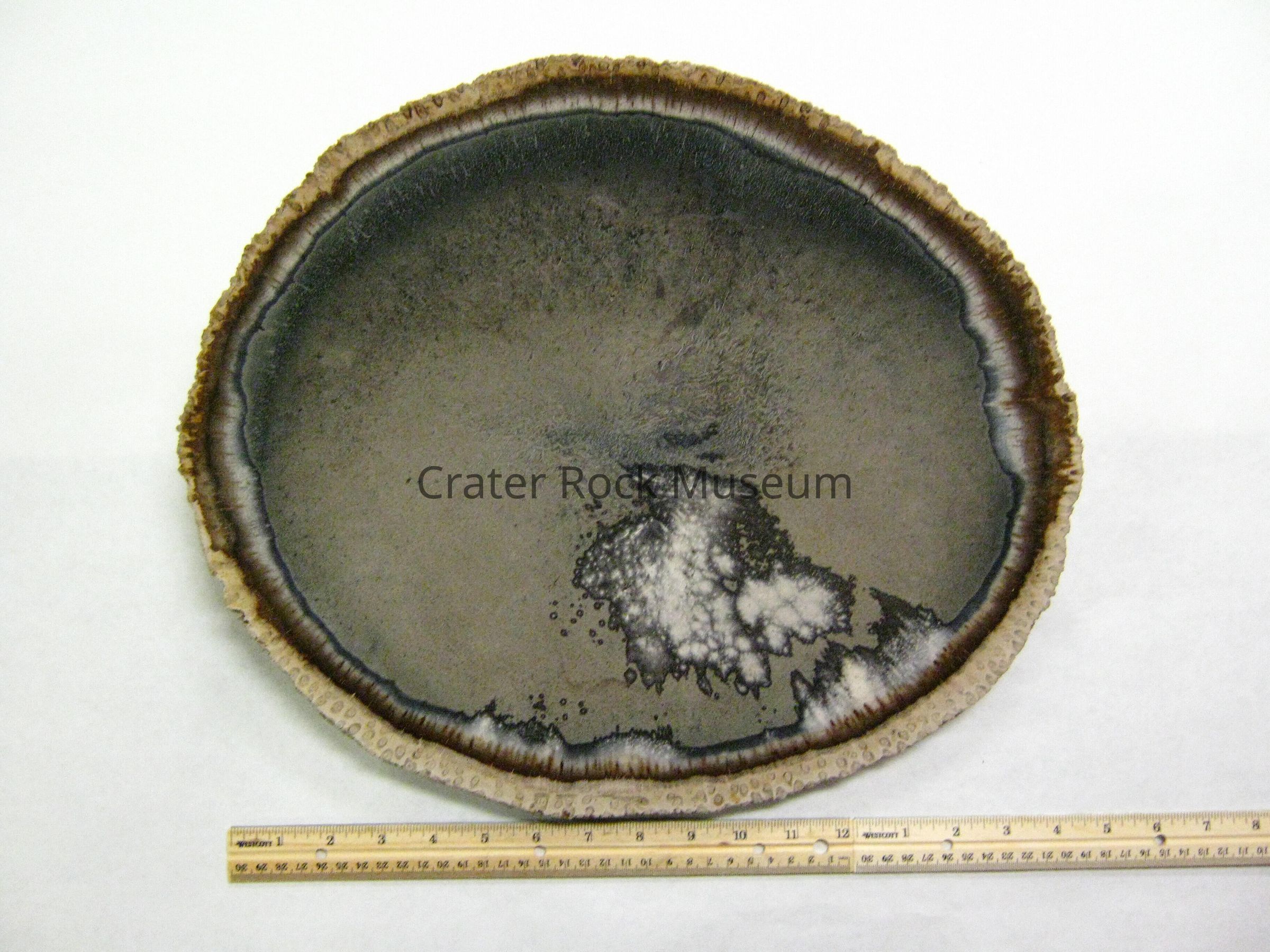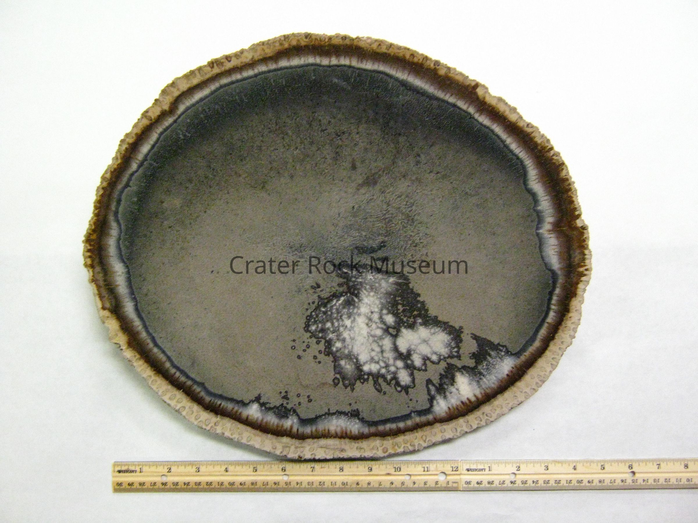 Description: Thick slice with polished face. One thick outer ring, beige and brown and some white. The inner area has black coloring in the upper region and the majority of the rest is grey to beige with a large spot of white and black in one area of the face.