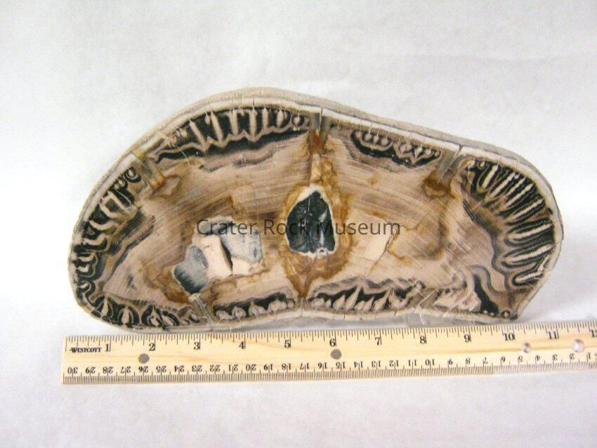 Description: Thick slab with polished face. Distinct black and beige"tiger stripe" pattern on outer areas of specimen. Inner area has visible growth rings in a light brown coloring with a black spot towards the center.
